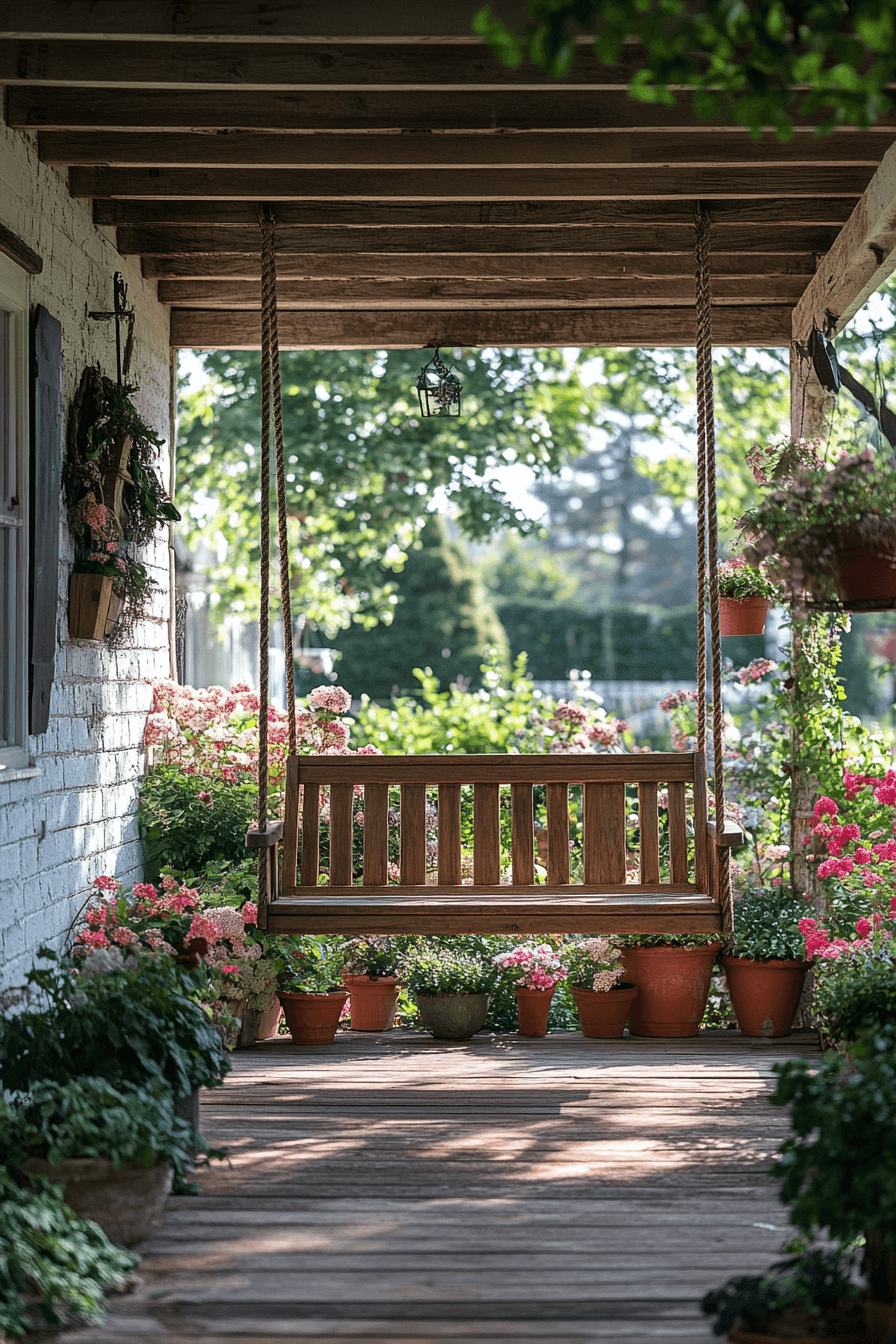 A classic porch swing remains one of the most heartwarming antique farmhouse decor ideas for outdoor living. Gently aged wood and soft cushions invite rest and relaxation. The swing creates a peaceful rhythm with every breeze. Its timeless look complements florals and neutral palettes alike. The porch becomes an instant retreat.
