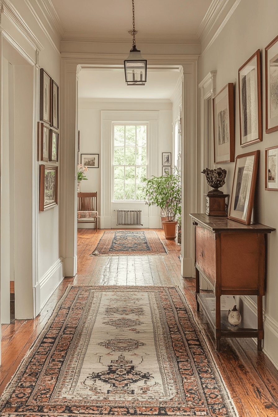 Heritage hallway runners highlight antique farmhouse decor ideas by adding softness and story underfoot. Faded patterns and muted colors create warmth in transitional spaces. They balance rustic floors while enhancing visual flow. Each step feels comforting and intentional. Hallways become more inviting and expressive.
