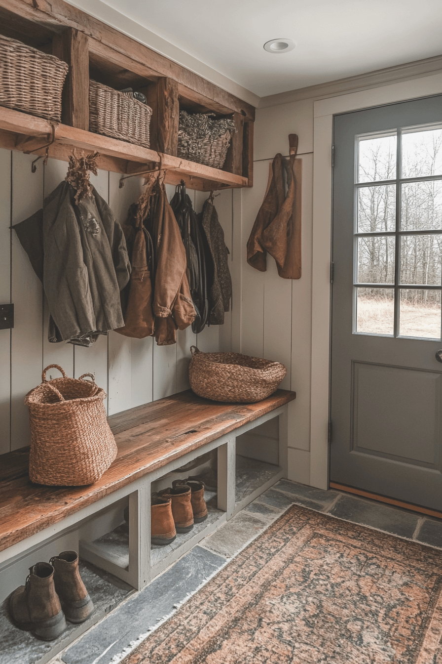 Traditional mudroom layouts shine within antique farmhouse decor ideas by blending charm with daily function. Vintage cubbies, reclaimed benches, and iron hooks create organized warmth. These hardworking elements feel durable and character-rich. The space remains calm even during busy routines. Practicality meets timeless style.
