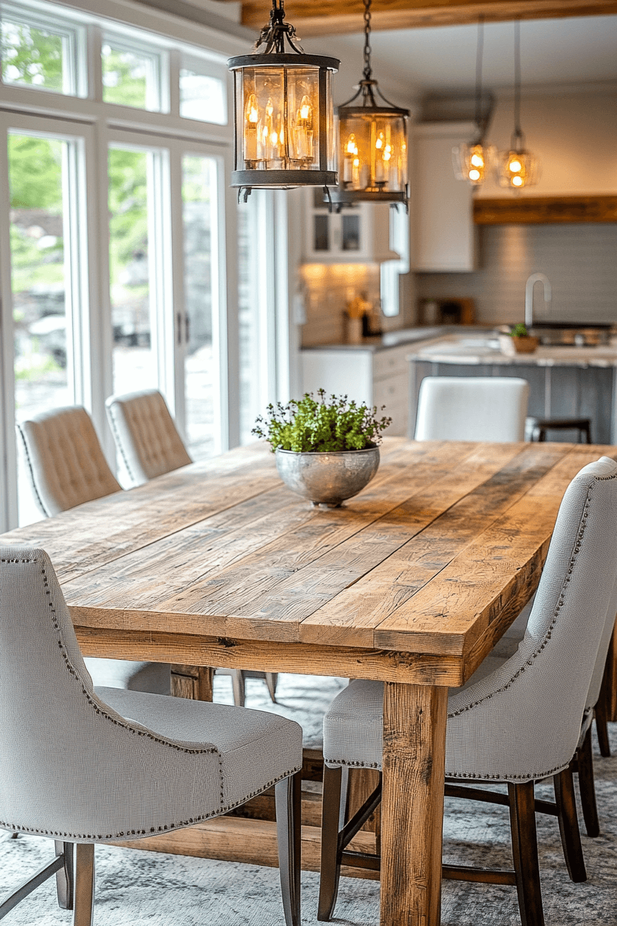 A timeworn wooden dining table perfectly represents antique farmhouse decor ideas that bring people together with warmth and history. Its worn surface reflects years of shared meals and meaningful moments. The sturdy craftsmanship grounds the room with authenticity and comfort. Natural grain patterns and aged tones elevate every gathering. It’s a statement piece that feels deeply personal and inviting.