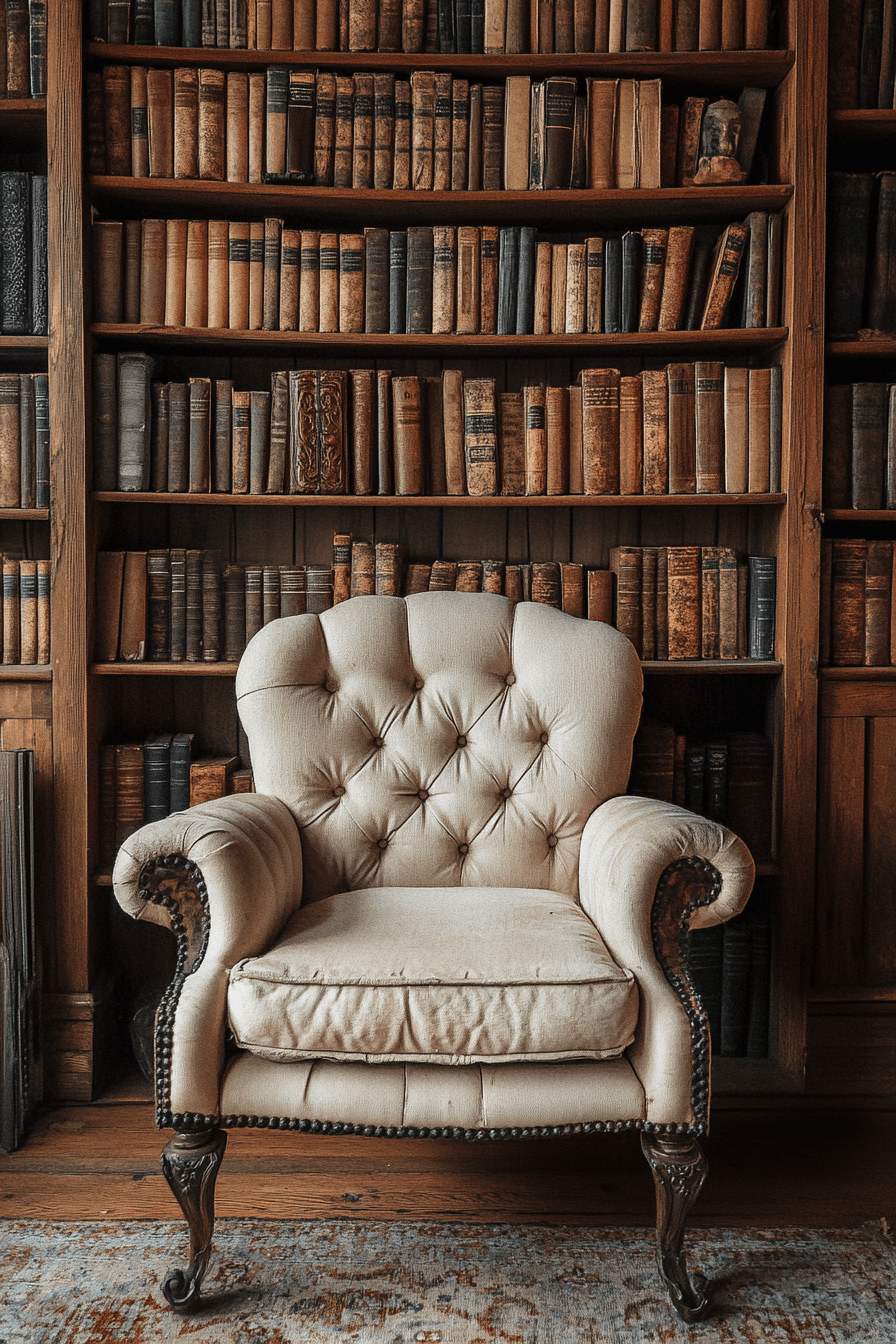 Vintage bookshelves beautifully express antique farmhouse decor ideas by blending warmth and function. Weathered wood adds depth and coziness. Styled with old books and personal objects, they feel grounded and soulful. Reading spaces become more inviting. Quiet moments feel intentional.
