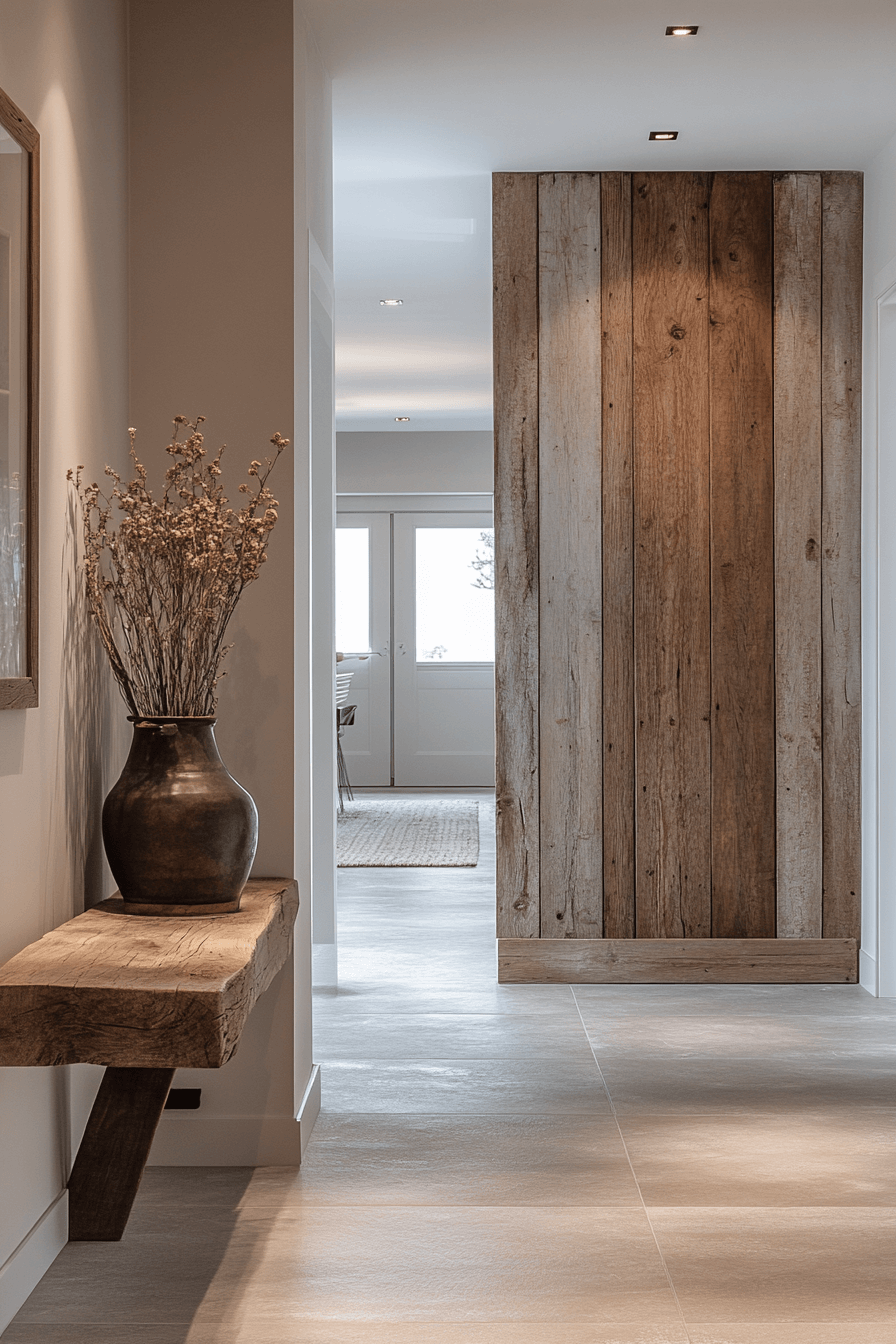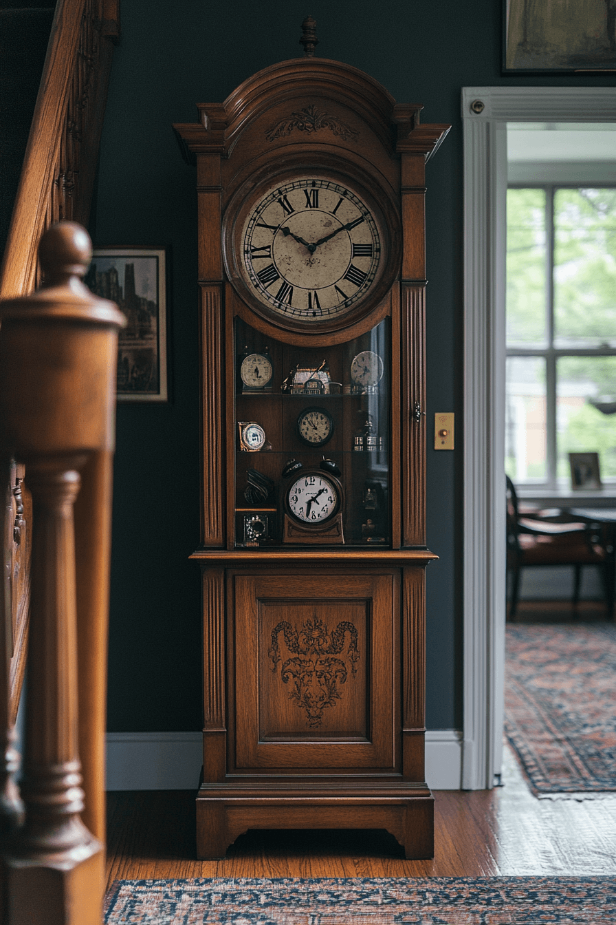 A grandfather clock instantly adds presence and tradition, making it one of the most striking antique farmhouse decor ideas for entryways. Its gentle ticking introduces rhythm and calm. Tall proportions create an elegant focal point that feels meaningful. Crafted wood and classic faces offer lasting beauty. It welcomes guests with quiet sophistication.