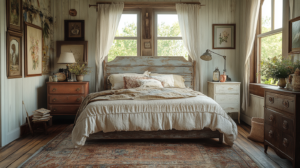 Bedrooms styled with antique farmhouse decor ideas naturally become calming spaces filled with character and comfort. Weathered wood, relaxed linens, and soft neutral tones work together effortlessly. Each vintage element adds depth without overwhelming the room. The balance between rustic texture and serene design feels intentional and soothing. It’s a space meant for rest and reflection.