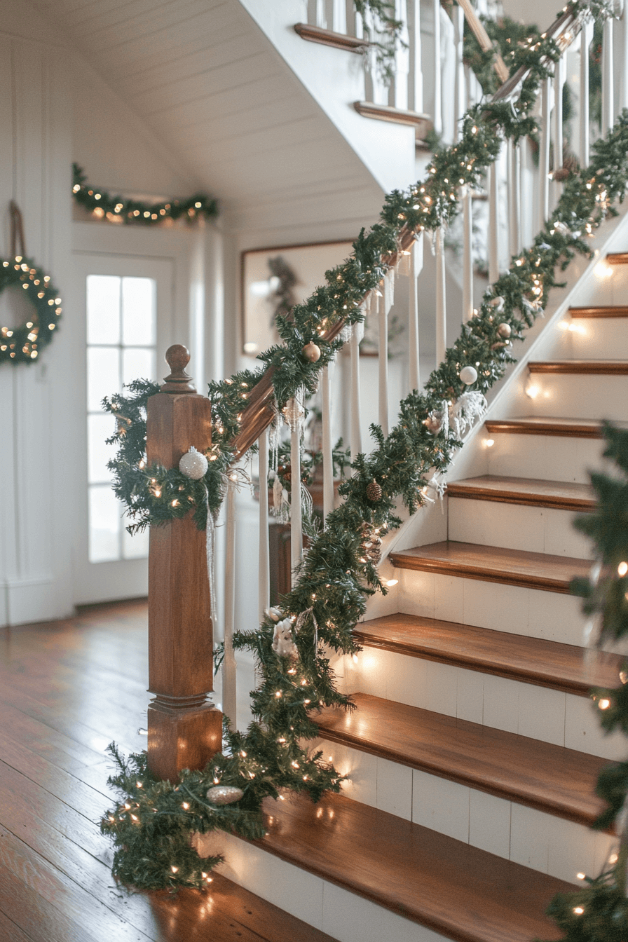 Garlands of pine and strands of soft white lights turn your staircase into a showstopping centerpiece. The mix of natural wood and glowing textures feels inviting and organic. Every step captures the essence of farmhouse Christmas decor in motion. It’s festive elegance made simple.