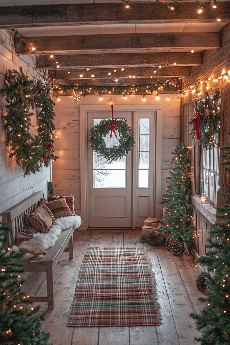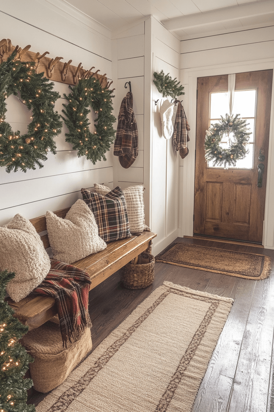 A mudroom decorated with garlands, wooden hooks, and glowing lights makes daily routines delightful. Wreaths, baskets, and earthy tones add layers of charm. Every inch reflects the natural elegance of farmhouse Christmas decor. It’s cozy, functional, and festive all at once.