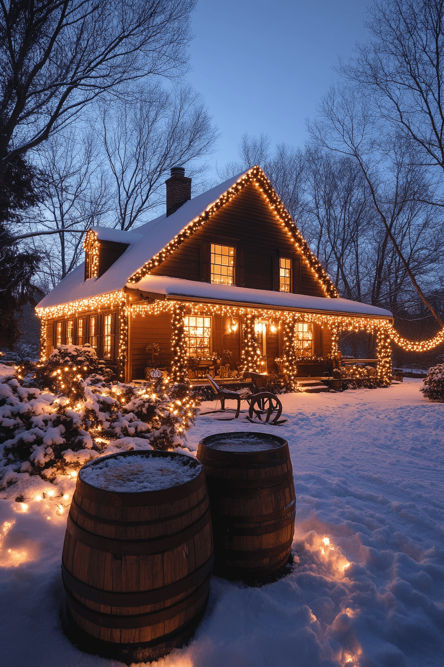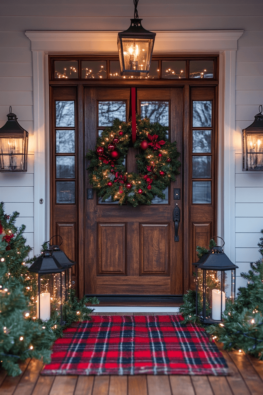 A front door framed with garlands and lanterns instantly says “Welcome Home.” Simple wreaths and wooden signs bring out the rustic charm of farmhouse Christmas decor. The glow of soft lights makes your entryway warm and inviting. It’s understated yet unforgettable.