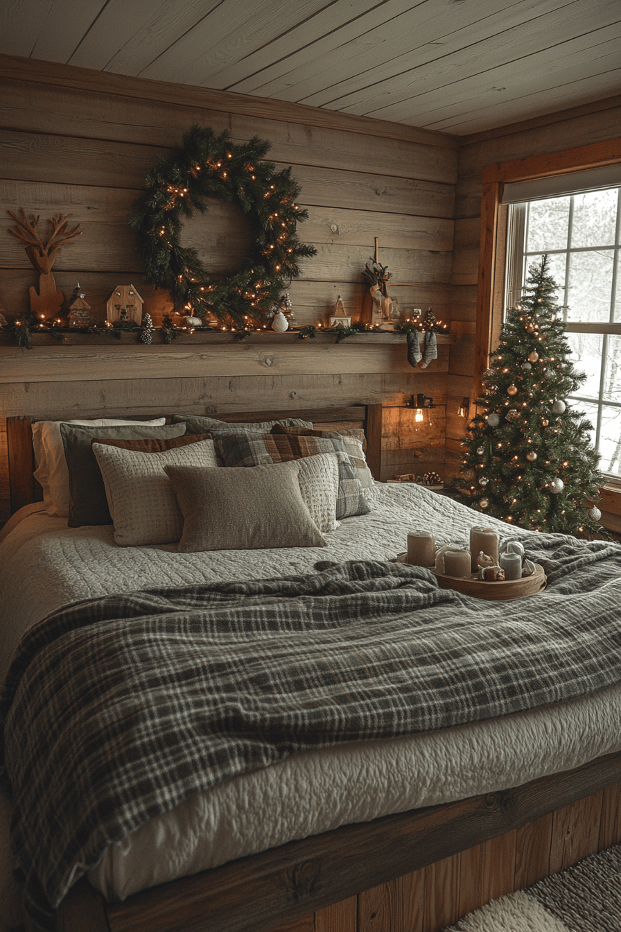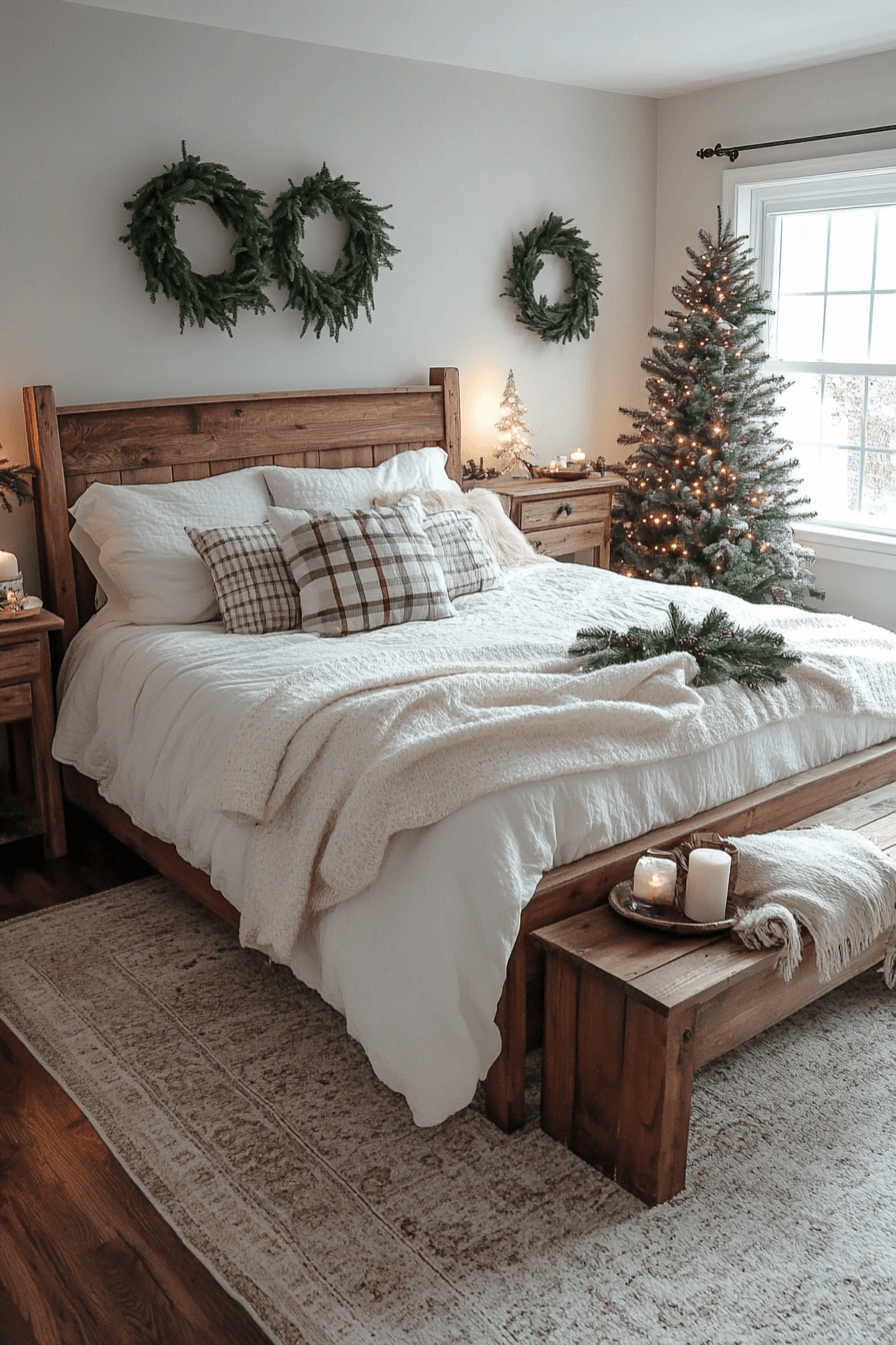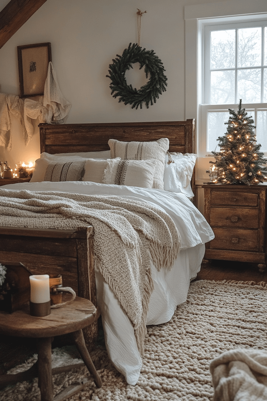 Turn your bedroom into a serene holiday escape where comfort meets timeless beauty. Layer cotton throws, twinkling lights, and neutral linens for a soothing, rustic vibe. Wooden headboards and garlands of greenery add to the peaceful energy. The textures and tones embrace the softness of farmhouse Christmas decor.