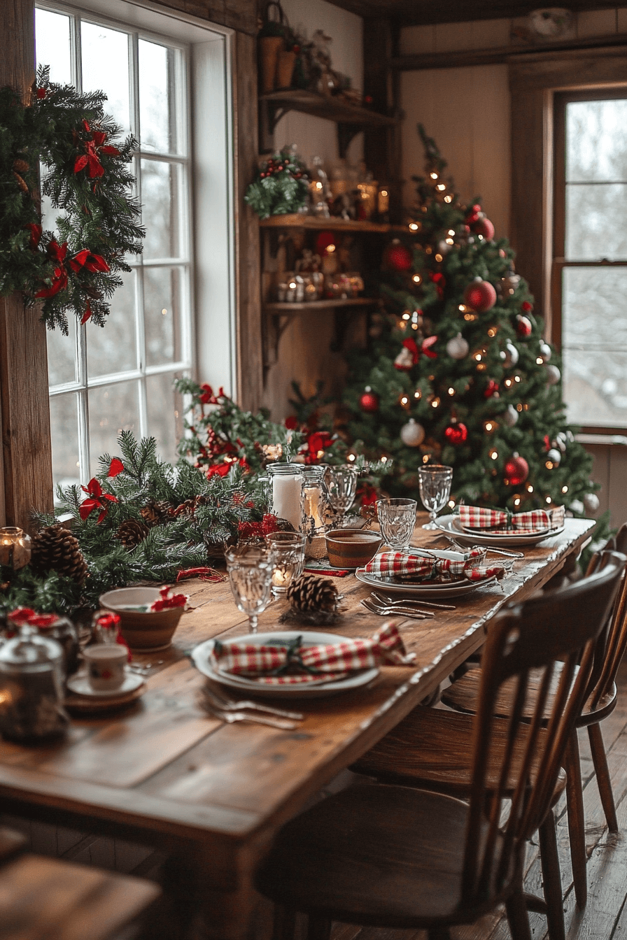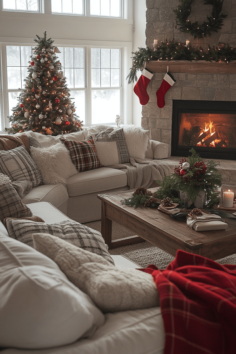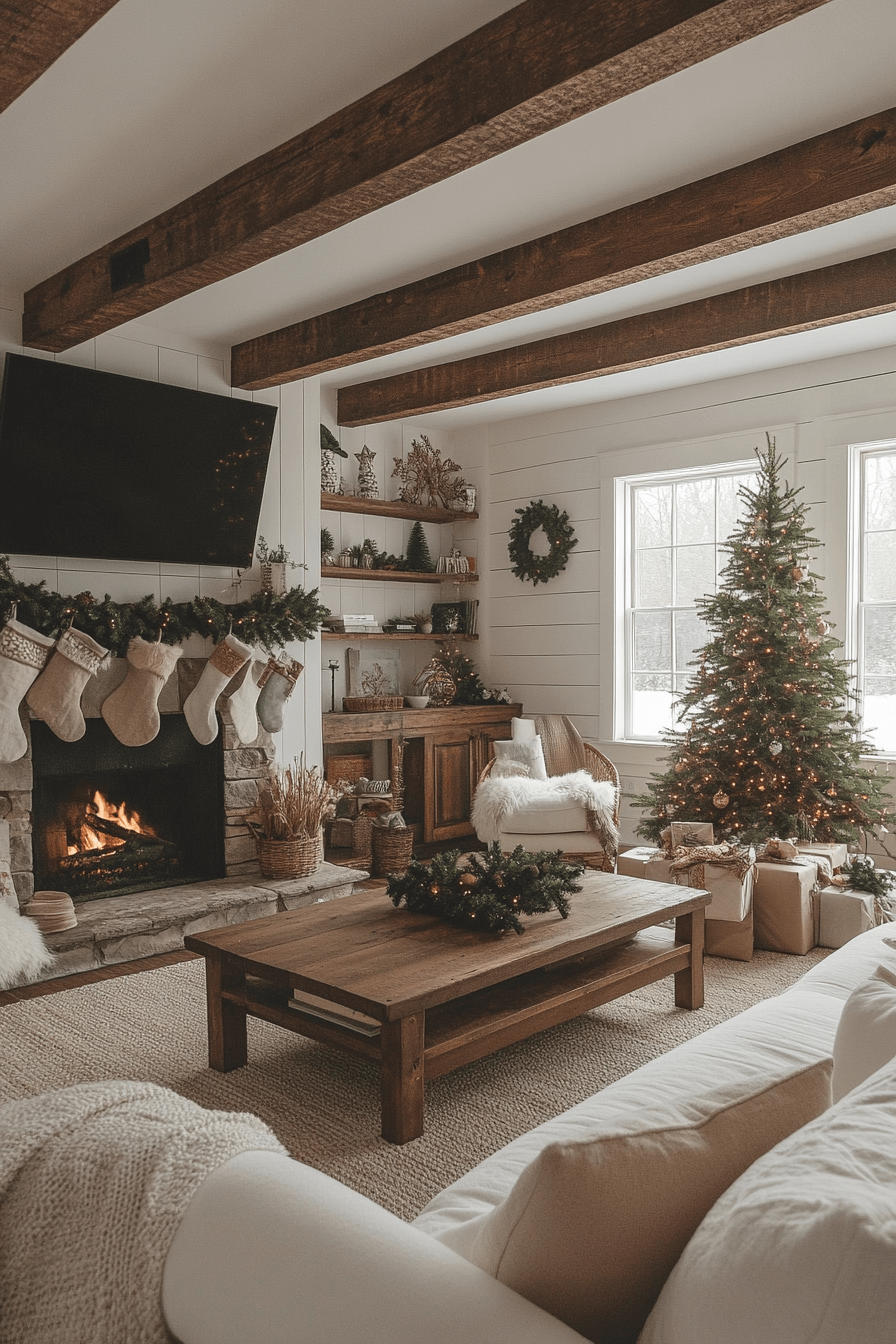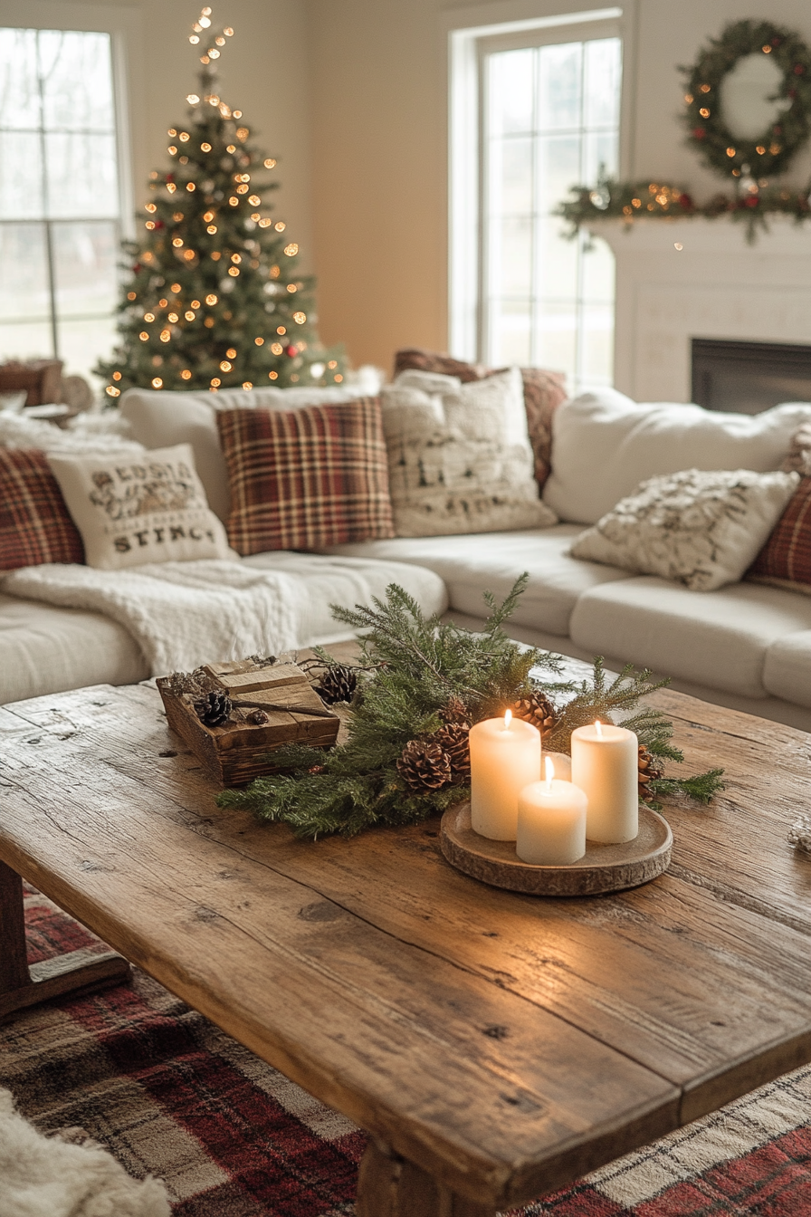Soft lighting, layered textures, and cozy plaid accents bring your living room to life with rustic warmth. Wooden tables, flickering candles, and simple greenery transform your space into a country Christmas retreat. Every little detail shines with heart and comfort. The relaxed elegance defines true farmhouse Christmas decor charm.