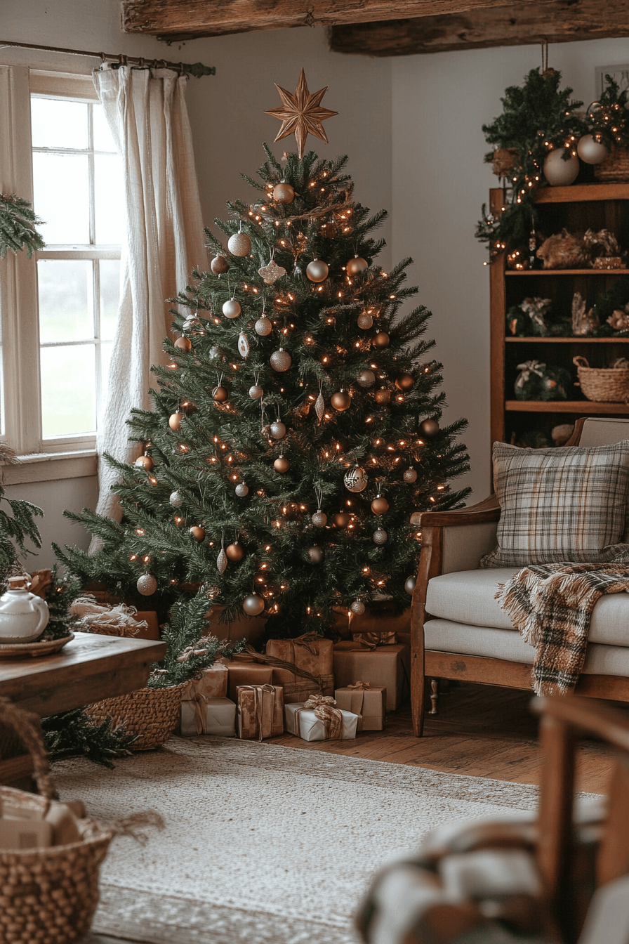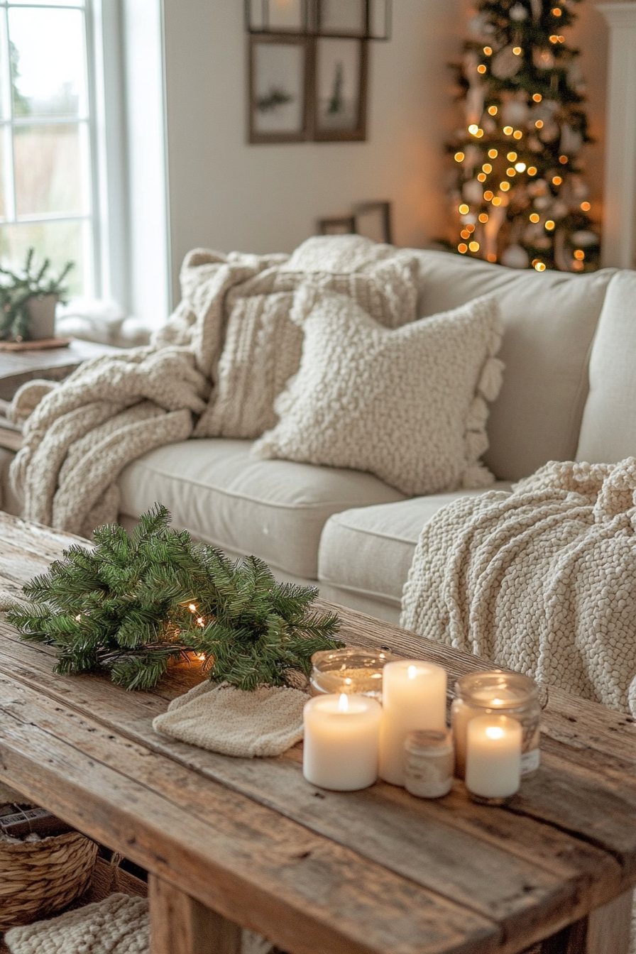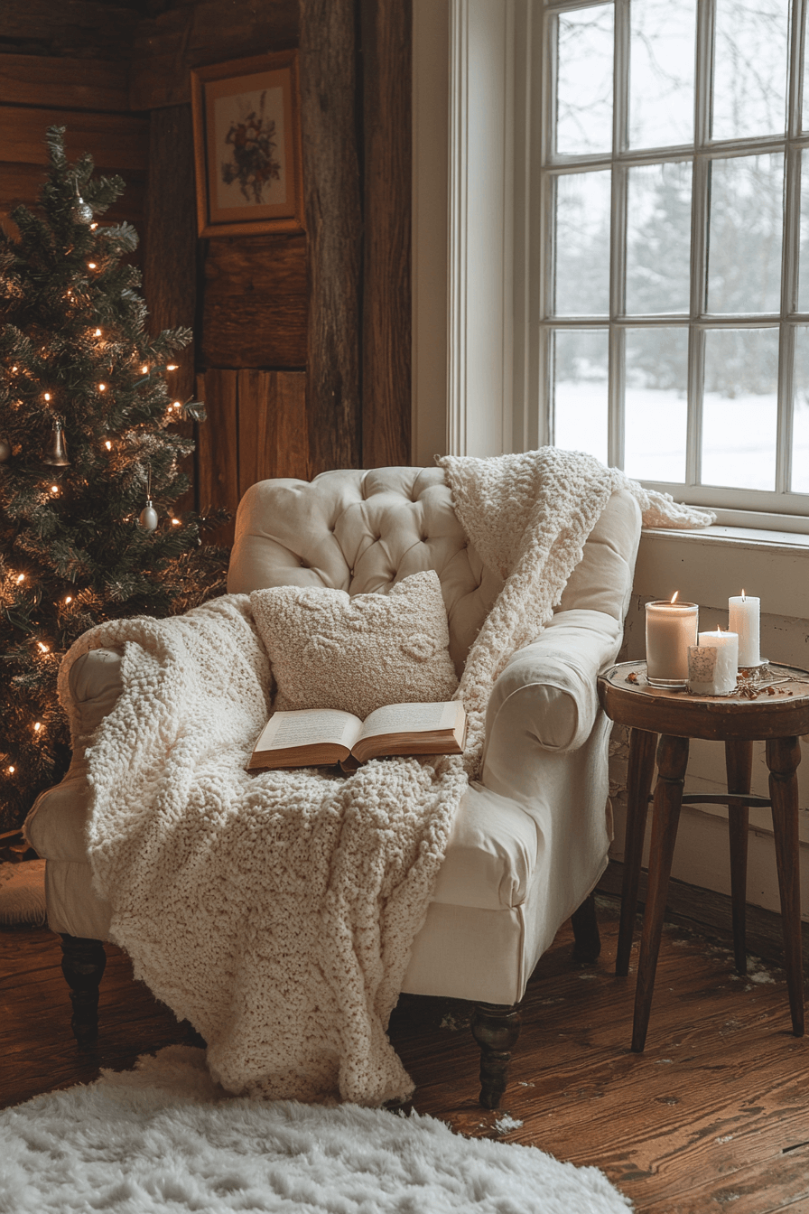 Create a peaceful reading nook filled with candles, blankets, and a small festive tree. The cozy setup captures the intimate beauty of farmhouse Christmas decor. Natural tones and soft fabrics invite calm and contentment. It’s your quiet escape during the holiday rush.