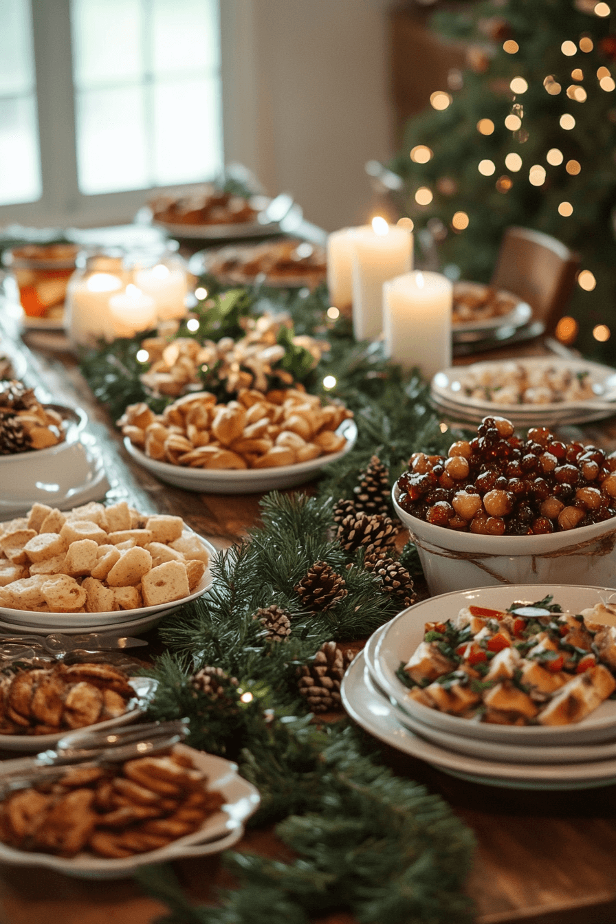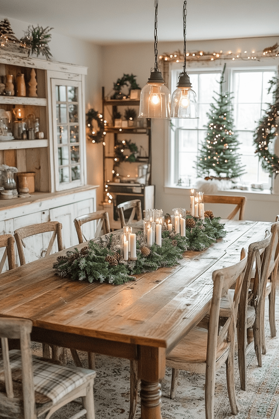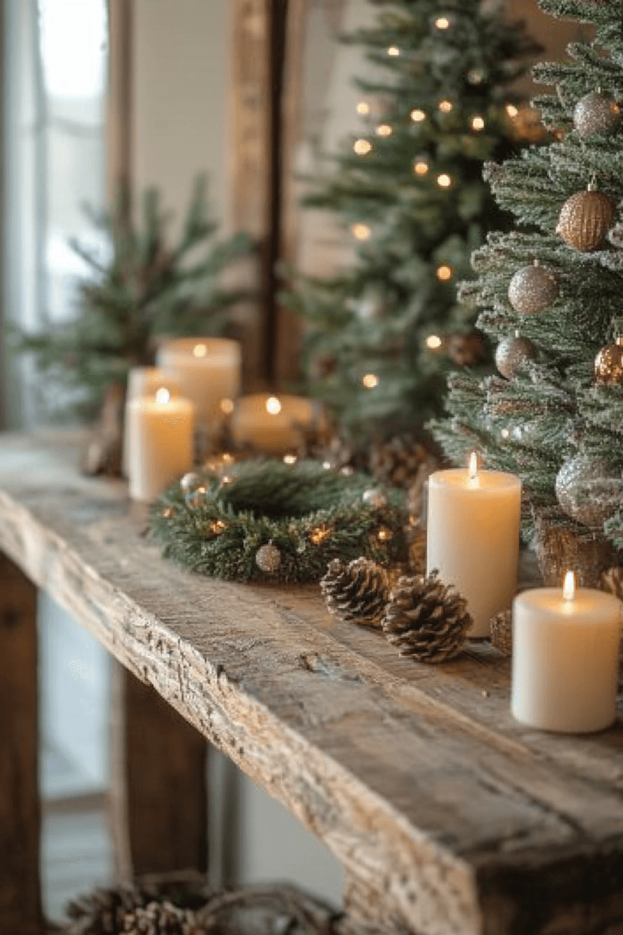 A buffet table layered with candles, greenery, and pinecones becomes the centerpiece of your gatherings. The textures create a soft, inviting glow that defines farmhouse Christmas decor. Natural details add effortless charm. It’s welcoming and picture-perfect.
