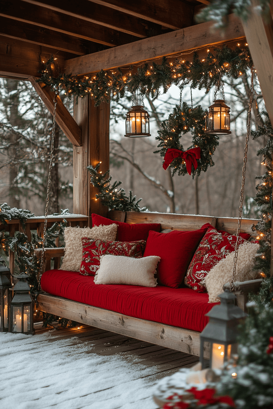 Plaid blankets, glowing lights, and fresh greenery make your porch swing the coziest seat in the house. The textures bring warmth while the lights set a tranquil mood. It’s the perfect expression of farmhouse Christmas decor. Simple, rustic, and full of joy.