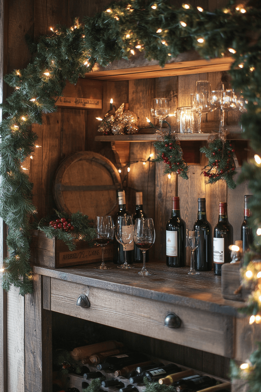 Transform your wine room into a rustic holiday hideaway with wood tones and gentle lighting. Garlands, candles, and greenery make every glass of wine feel more festive. The combination exudes sophistication and warmth. It’s a perfect match for farmhouse Christmas decor elegance.
