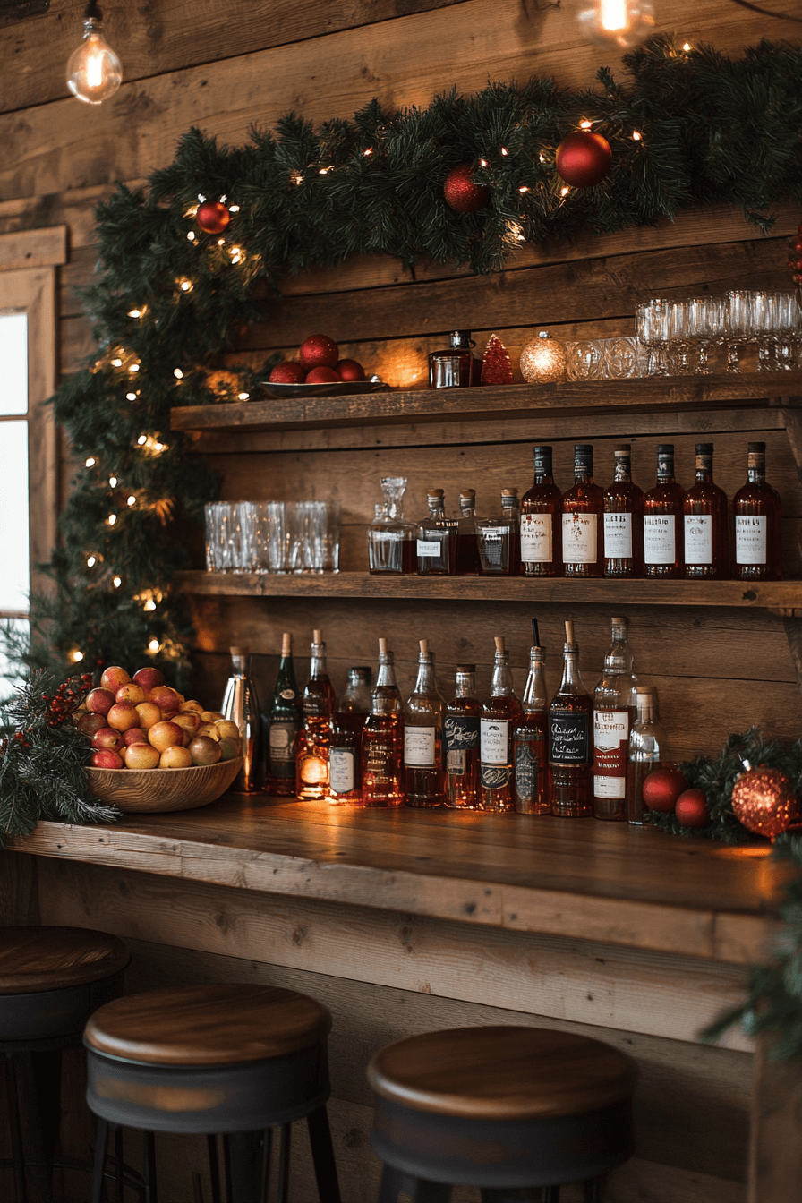 Garlands of greenery and sparkling lights give your wet bar a relaxed holiday flair. Wooden shelves, glassware, and twinkle lights tie in the cozy charm of farmhouse Christmas decor. It’s festive, functional, and full of character. Every drink feels like a toast to the season.