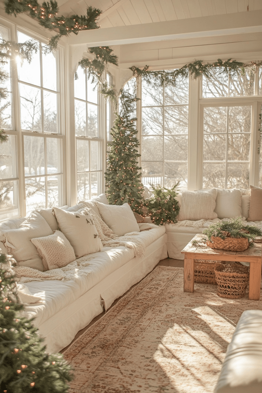 Fill your sunroom with light and nature for a serene Christmas escape. Soft textiles, evergreen accents, and sunlight make it feel open and joyful. The balance of materials captures the essence of farmhouse Christmas decor. It’s bright, calm, and perfectly festive.