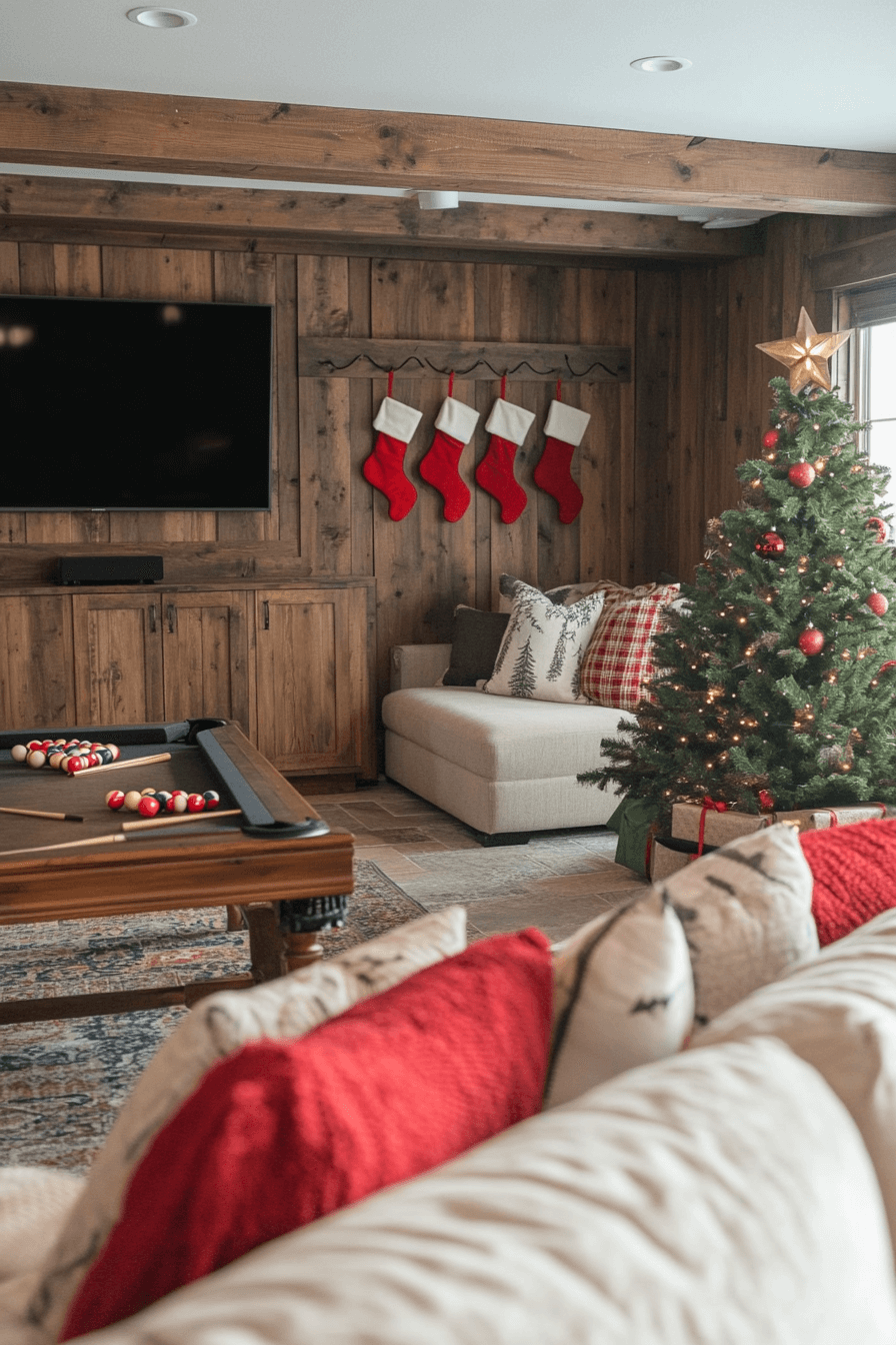 A basement transformed with garlands, glowing trees, and cozy furnishings becomes your holiday hideaway. The earthy tones and wooden accents reflect pure farmhouse Christmas decor warmth. It’s both stylish and comforting. Every corner feels like home.