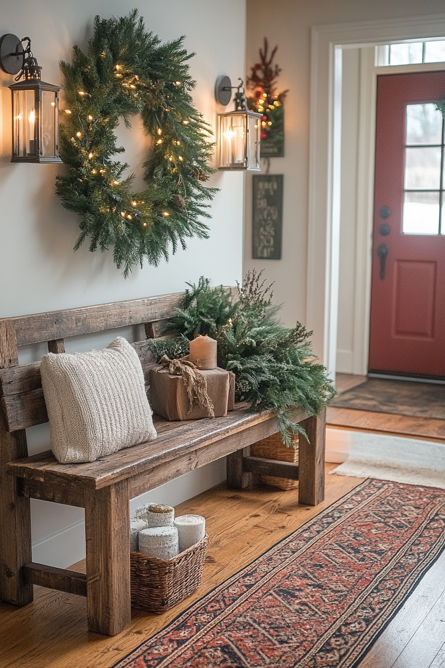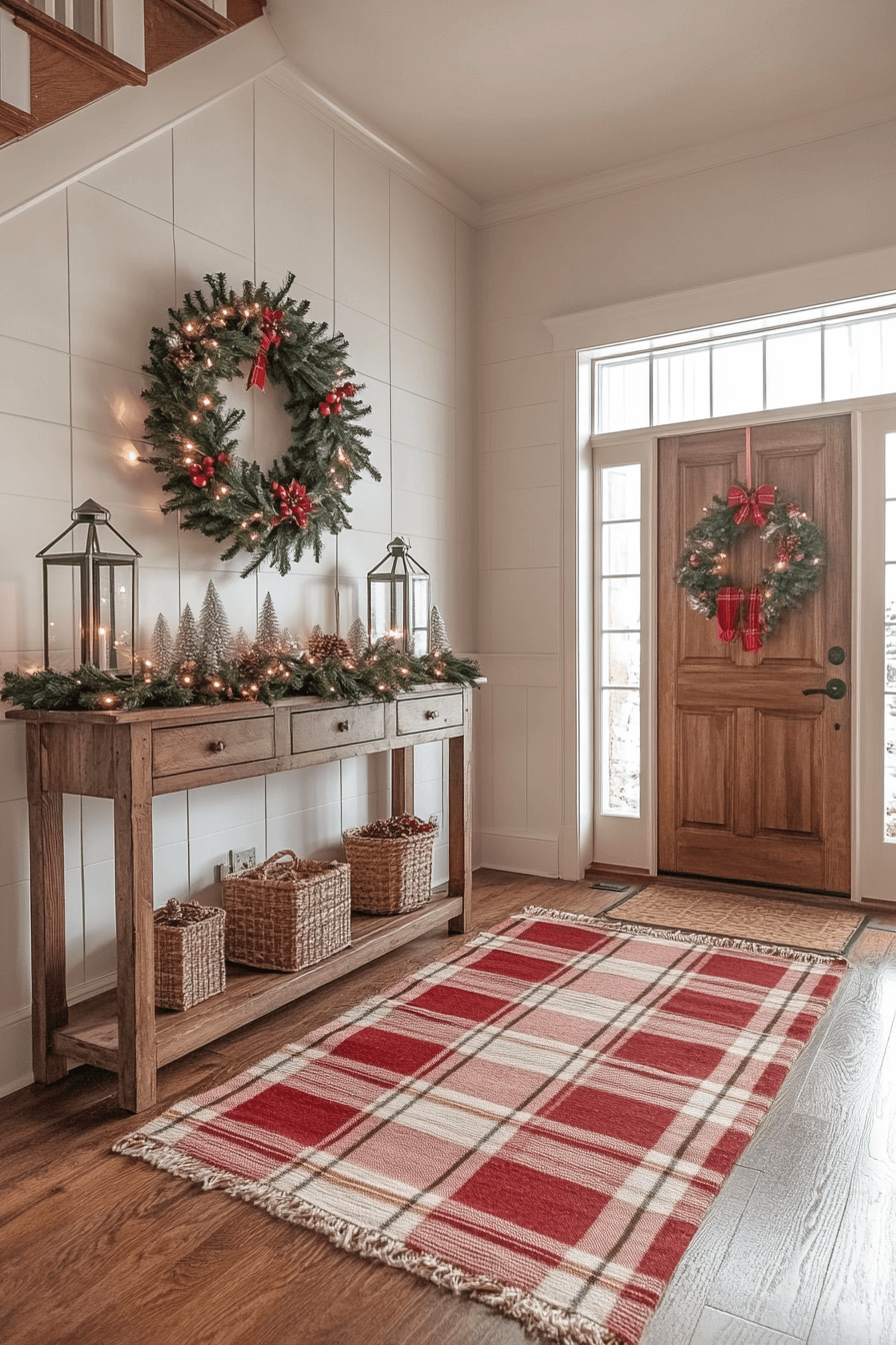 Greet guests with a foyer that radiates rustic elegance and cheerful light. Wooden benches, greenery, and warm lanterns bring out the natural charm of farmhouse Christmas decor. Every touch feels heartfelt and inviting. It’s the perfect welcome to your home.