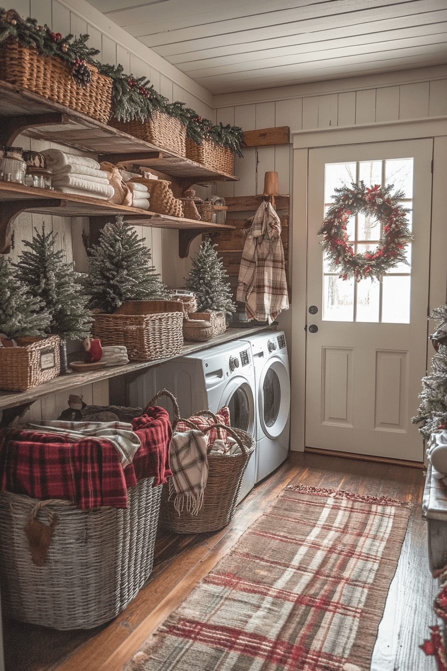 Add small touches of holiday happiness to your laundry space for a cozy surprise. A mini wreath, woven baskets, and string lights bring warmth to everyday chores. Wooden textures and hints of greenery highlight the simplicity of farmhouse Christmas decor. Even the smallest corners can sparkle with joy.