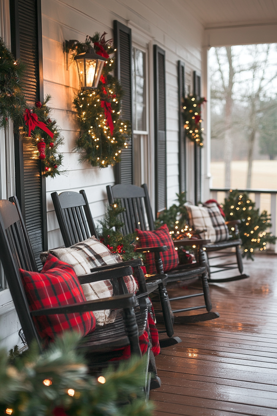 Twinkling lights, plaid bows, and greenery make your porch the perfect holiday retreat. Add rocking chairs and cozy throws for a space that feels inviting from the street. The rustic touches and layered textures give off irresistible warmth. Every sparkle enhances the beauty of farmhouse Christmas decor.