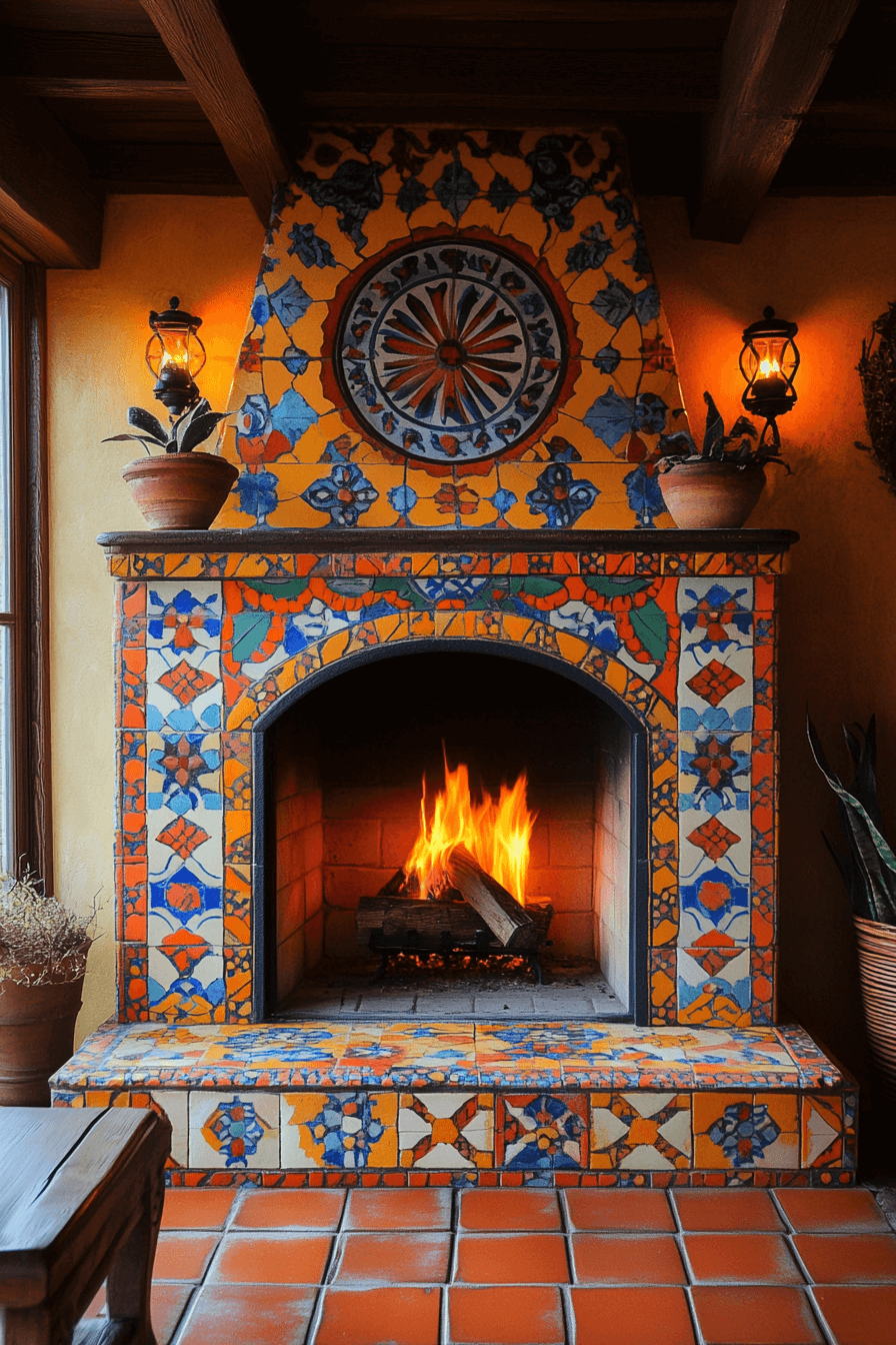 Mediterranean tilework fireplaces inject vibrant colors and cultural richness into any space, making them one of the most spirited fireplace interior ideas. Hand-painted tiles add personality and create a captivating focal point in your room. Pair them with neutral decor for a balanced, inviting space.