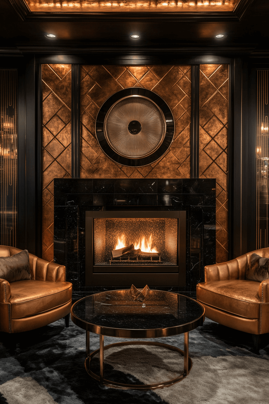 Art deco fireplaces add vintage glamour and high drama, making them one of the most striking fireplace interior ideas. With bold geometric patterns, mirrored finishes, and sculptural designs, they instantly elevate any space. These fireplaces add timeless elegance and shine, perfect for luxury interiors.