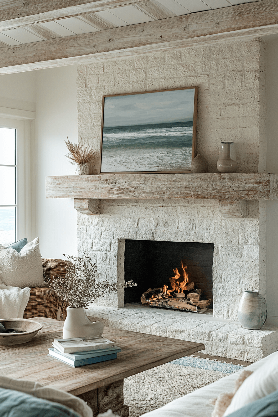 Beach house fireplaces bring a sense of coastal relaxation indoors, ranking high among fireplace interior ideas. Soft, weathered finishes and light-colored stones mimic the serene vibe of the beach. These fireplaces create a calm, inviting atmosphere, perfect for open-concept spaces.