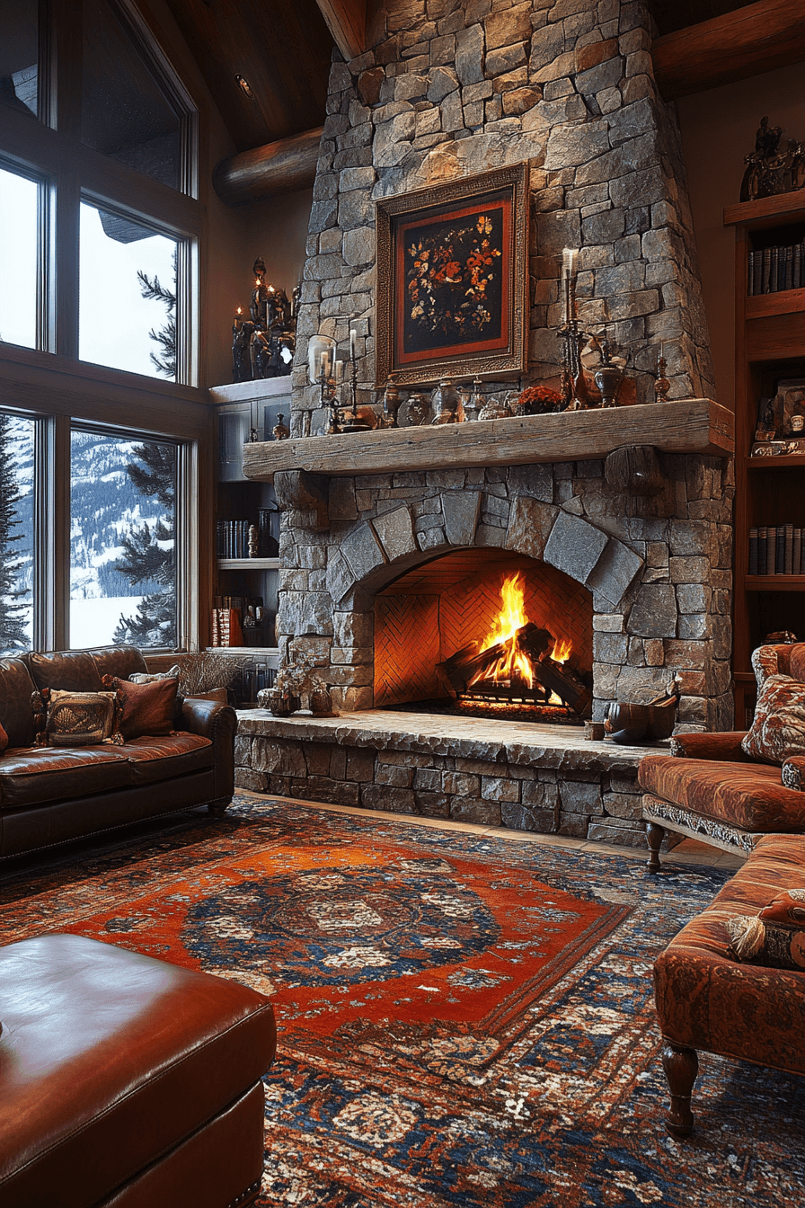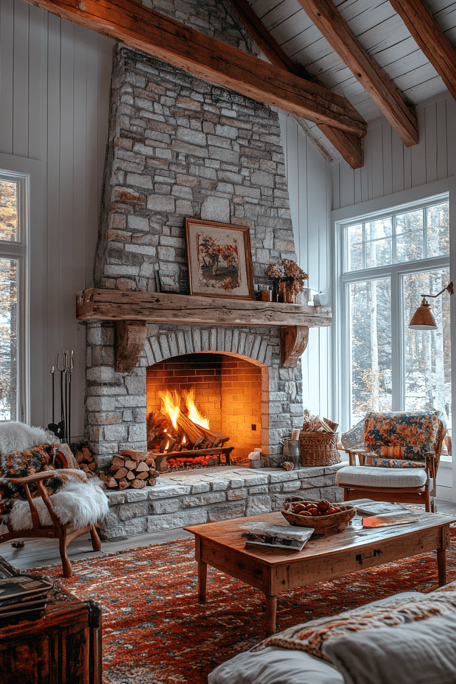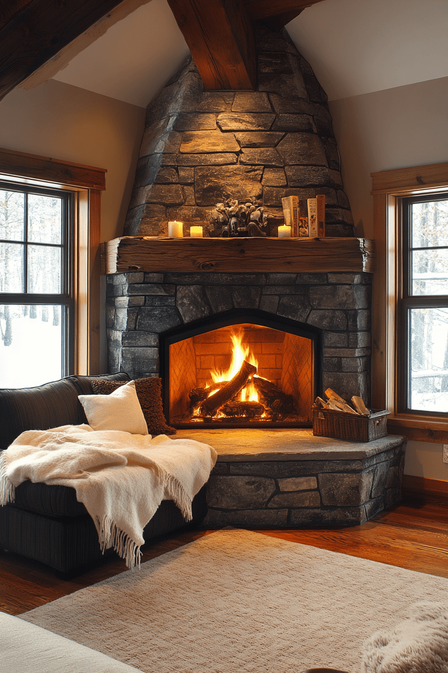 Stone hearths create one of the most grounding and nature-inspired fireplace interior ideas. Their organic textures and earthy tones establish a warm and inviting environment. The raw stone pairs beautifully with wooden accents and cozy fabrics, offering both comfort and style. Each stone tells a unique story of nature’s beauty.