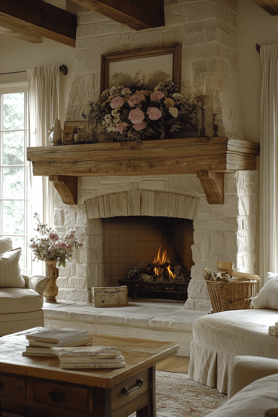 Cottage-style hearths exude warmth and charm, making them ideal fireplace interior ideas for those seeking cozy, rustic comfort. With rough stone, vintage accessories, and distressed wood details, these fireplaces feel lived-in and welcoming. They’re perfect for creating a comfortable, intimate atmosphere.