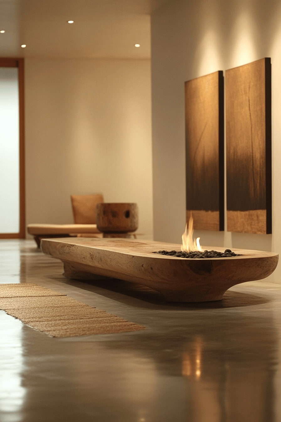 Asian-inspired fireplaces promote peace and clarity, offering one of the most serene fireplace interior ideas for minimalist homes. Clean lines, natural stone, and warm wood tones create a harmonious atmosphere. These fireplaces elevate the space with simplicity and calmness, ideal for Zen-inspired interiors.