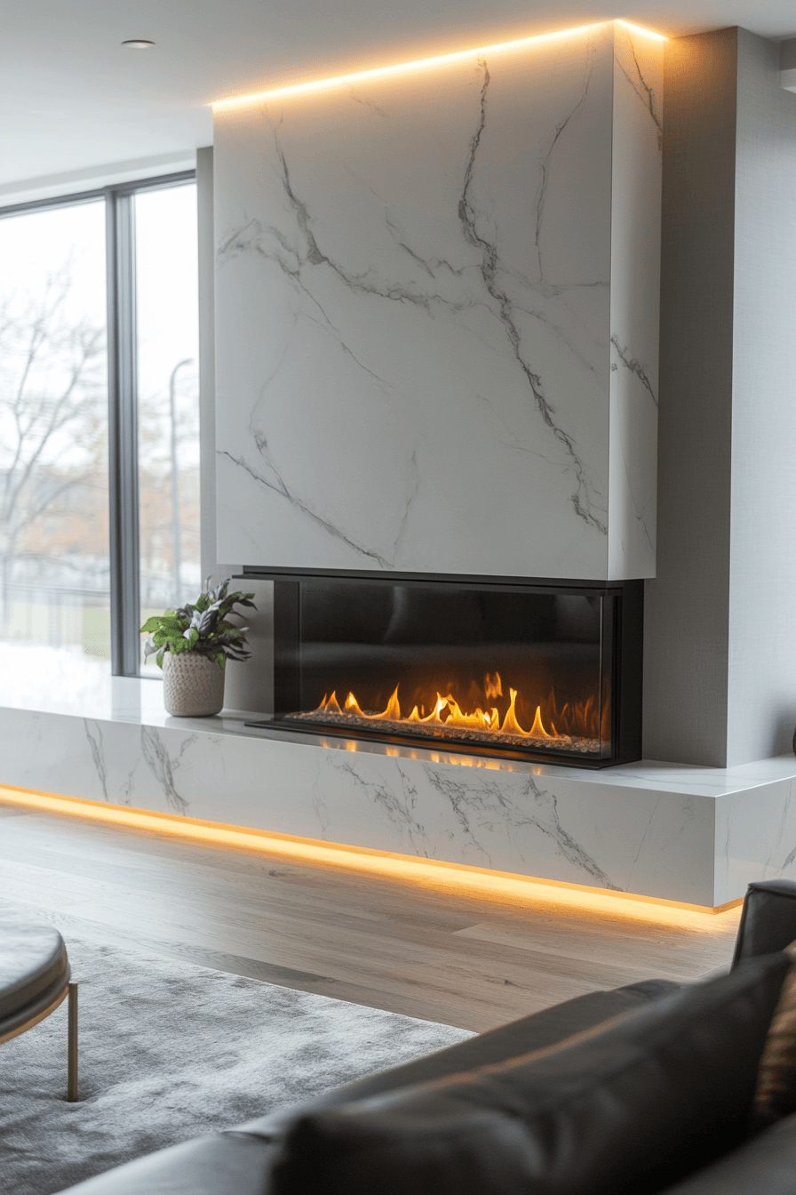 Marble fireplaces stand out as one of the most luxurious fireplace interior ideas, offering glossy finishes and natural elegance. The soft veining in each piece adds a touch of artistry, reflecting light and sophistication. Marble creates an elegant and timeless look, making it a favorite in both classic and modern spaces. It’s a statement of refinement that complements any home style.