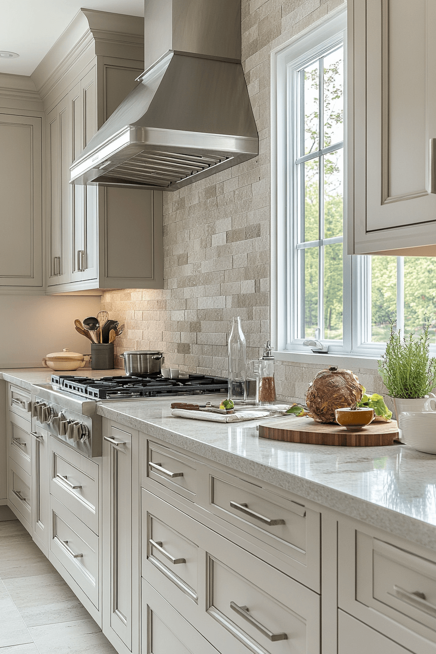 Stone-inspired finishes ground kitchens that rely on neutral kitchen cabinets for balance and sophistication. Subtle gray undertones add modern depth while maintaining warmth. This shade works well with stainless steel, textured tile, and sculptural lighting. The look feels calming without being dull. It supports both bold and minimal design choices.