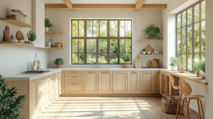 Cream-toned cabinetry creates an immediate sense of calm in spaces designed around neutral kitchen cabinets. The light-reflective quality brightens the room while maintaining a soft, cozy feel. This shade pairs effortlessly with stone, wood, and woven textures for a layered yet harmonious look. The result feels fresh without losing warmth. It is a style that adapts easily to changing decor tastes.