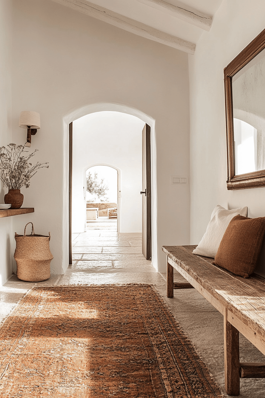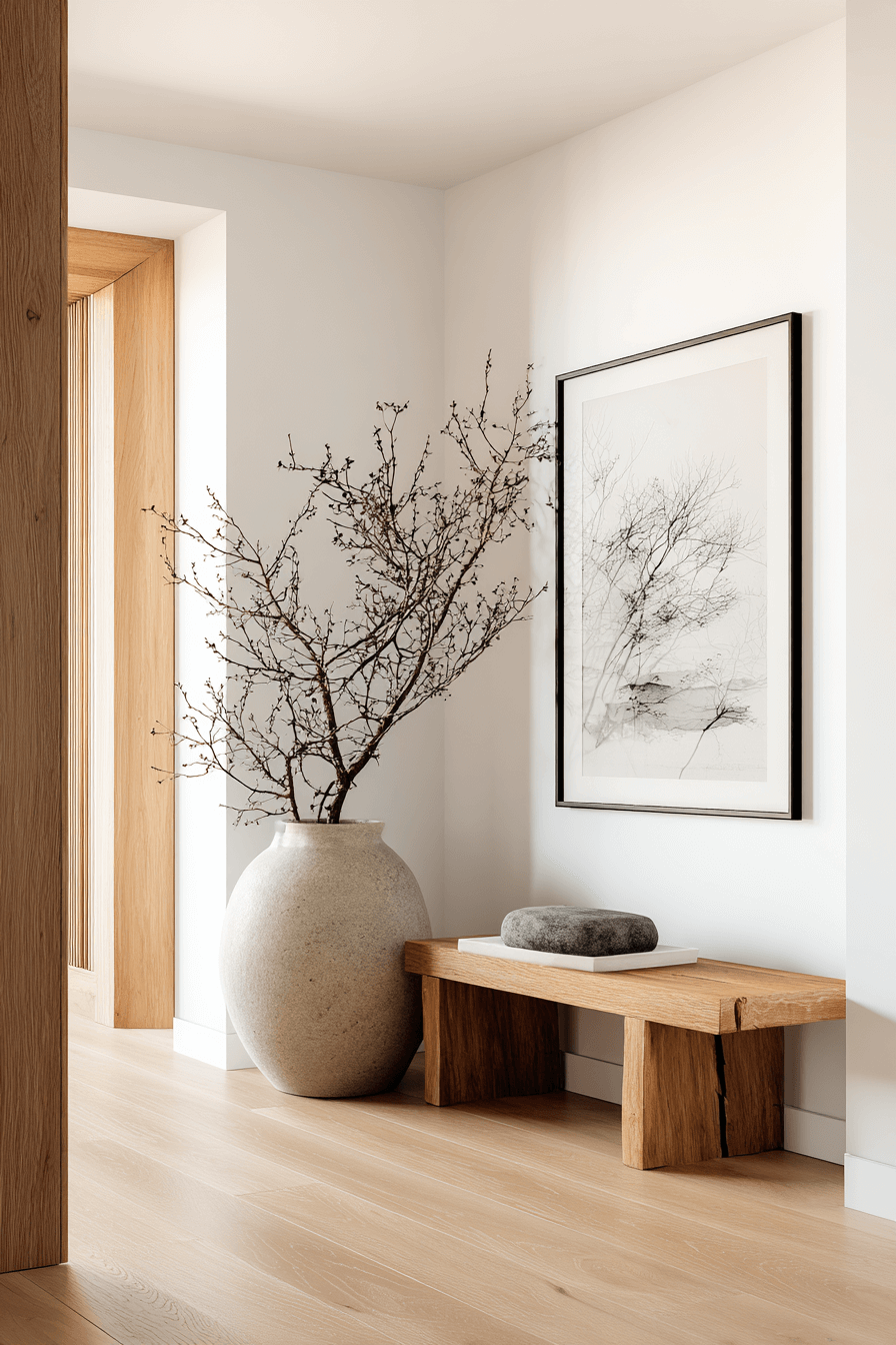 A serene entry hall reflects the thoughtful balance of a scandinavian japanese interior through clean finishes and warm wood tones. Concealed storage maintains a clutter-free appearance. A simple bench adds both function and calm. Each element is positioned with flow in mind. The space feels welcoming and composed.