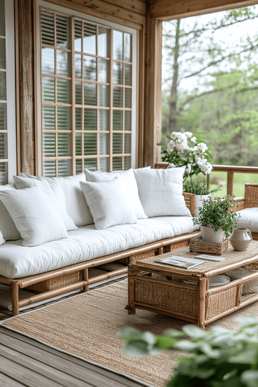 This porch design blurs the boundary between indoors and outdoors through the refined simplicity of a scandinavian japanese interior. Clean lines and light wood finishes create an airy, relaxed atmosphere. Screen elements soften sunlight while maintaining privacy. Minimal seating encourages mindful pauses throughout the day. The space feels calm in every season.