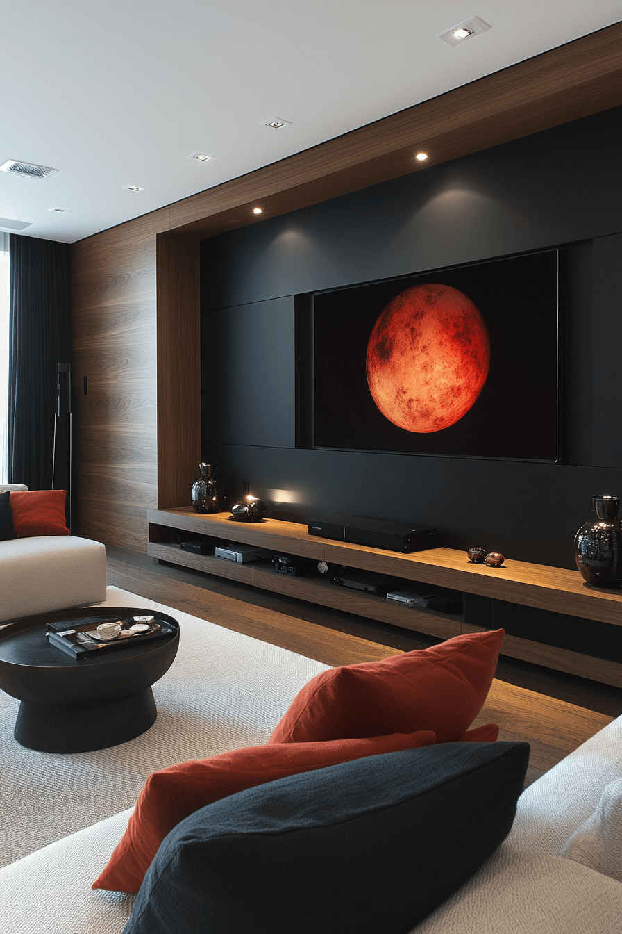 A minimalist media room achieves balance by applying the calming logic of a scandinavian japanese interior. Neutral colors and low seating keep the room grounded and relaxed. Integrated technology blends seamlessly into the design. Soft ambient lighting enhances comfort without distraction. The space remains functional while preserving tranquility.
