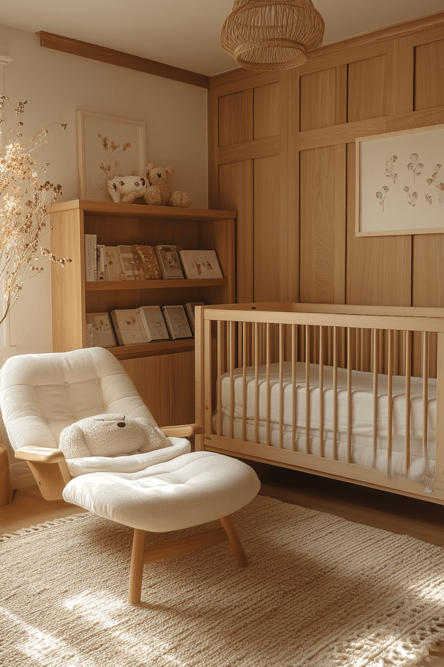This nursery embraces the softness of a scandinavian japanese interior with gentle colors and natural materials. Child-friendly furniture supports safety while maintaining visual calm. Built-in storage keeps the room organized and peaceful. Muted tones encourage restful sleep and quiet play. Handcrafted accents add warmth without overstimulation.
