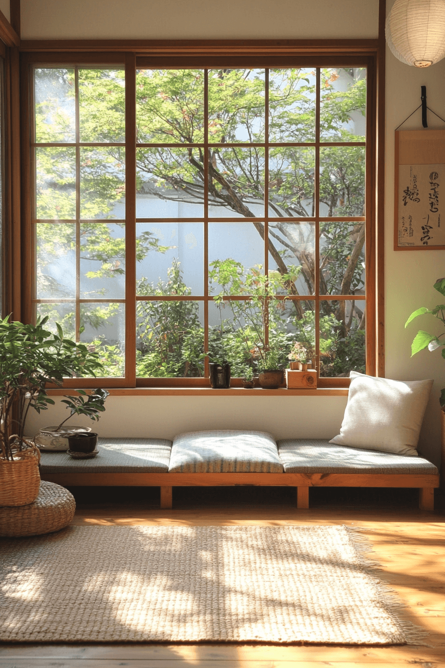 Natural light fills this sunroom, highlighting the tranquil beauty of a scandinavian japanese interior. Wood-framed windows strengthen the connection to nature. Simple seating invites moments of reflection and rest. Soft neutrals maintain visual calm throughout the day. Every detail supports clarity and stillness.