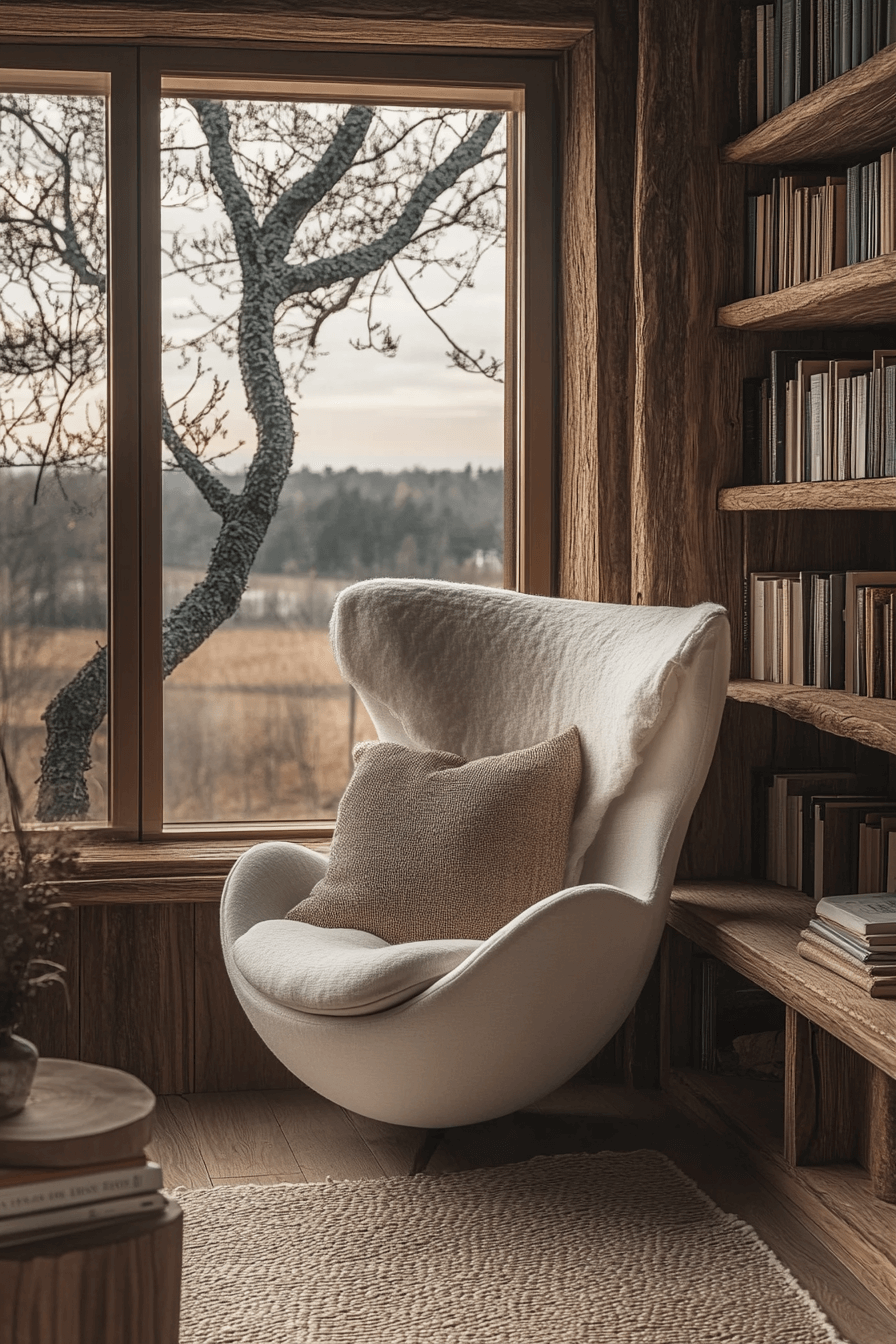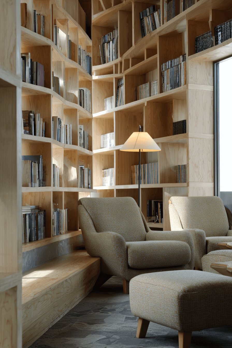 A cozy home library reflects the quiet charm of a scandinavian japanese interior through simplicity and warmth. Pale wood shelving creates visual softness. Natural light enhances the calm and uncluttered atmosphere. Seating remains comfortable yet minimal. The space encourages slowing down and reflection.