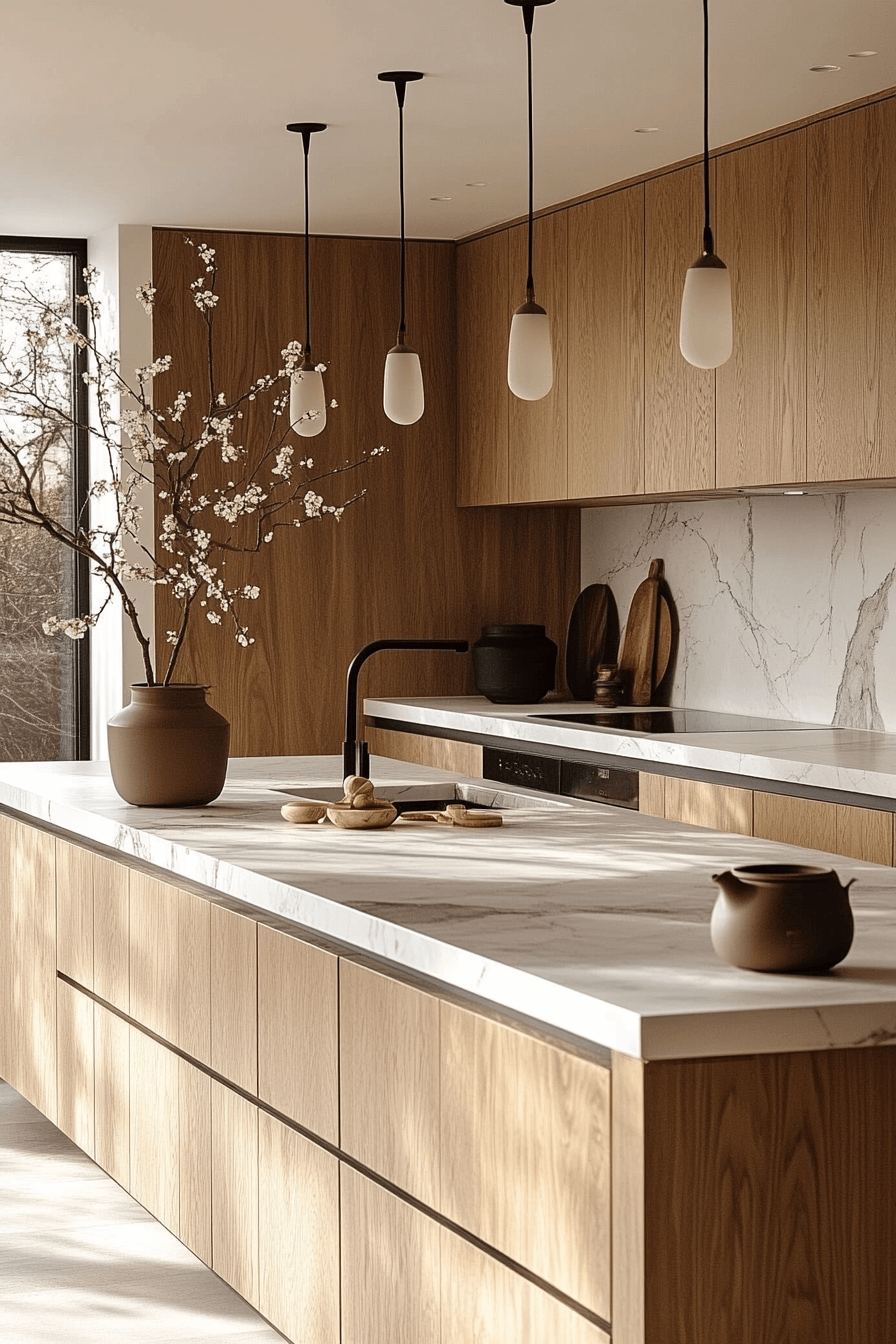 This kitchen showcases the quiet beauty of a scandinavian japanese interior by combining efficiency with soft, natural materials. Warm wood cabinetry pairs effortlessly with stone surfaces to create a functional yet soothing workspace. Open shelving keeps the room visually light while highlighting carefully selected pieces. Built-in appliances preserve a clean and seamless appearance throughout. Every detail supports flow, simplicity, and comfort.