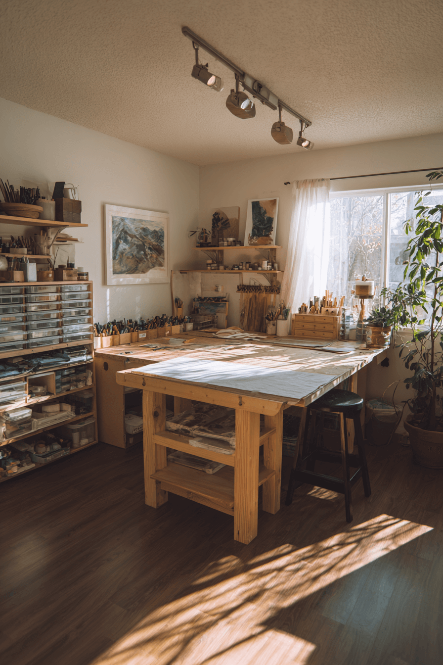 This creative studio balances function and refinement through a scandinavian japanese interior approach. Natural materials and diffused lighting support focus and ease. Organized shelving maintains clarity while allowing inspiration to flow. The layout encourages creativity without distraction. The space feels light and intentional.
