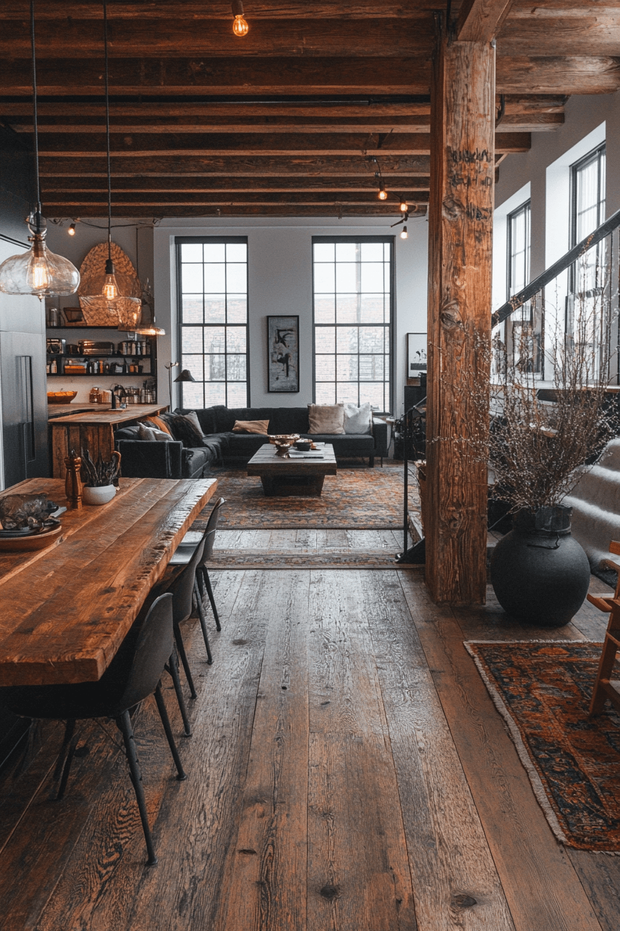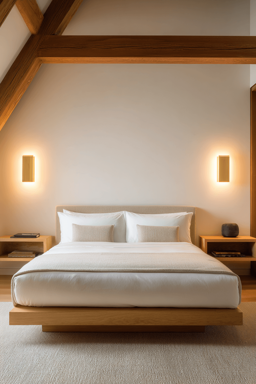 A timber-framed loft becomes a peaceful retreat through the influence of a scandinavian japanese interior. Exposed beams add warmth while large windows invite openness. Low furnishings maintain visual balance. Organic textures soften the architectural structure. The space feels restorative and airy.