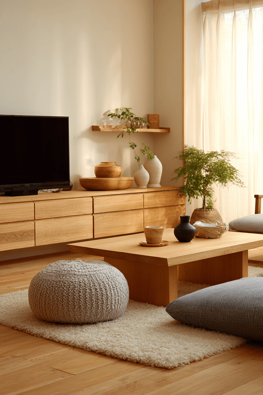 This family room demonstrates how a scandinavian japanese interior supports everyday living with simplicity and warmth. Soft textiles and natural hues create a welcoming environment. Hidden storage keeps the space flexible and uncluttered. Clean lines allow the room to adapt easily. The design feels calm yet practical.