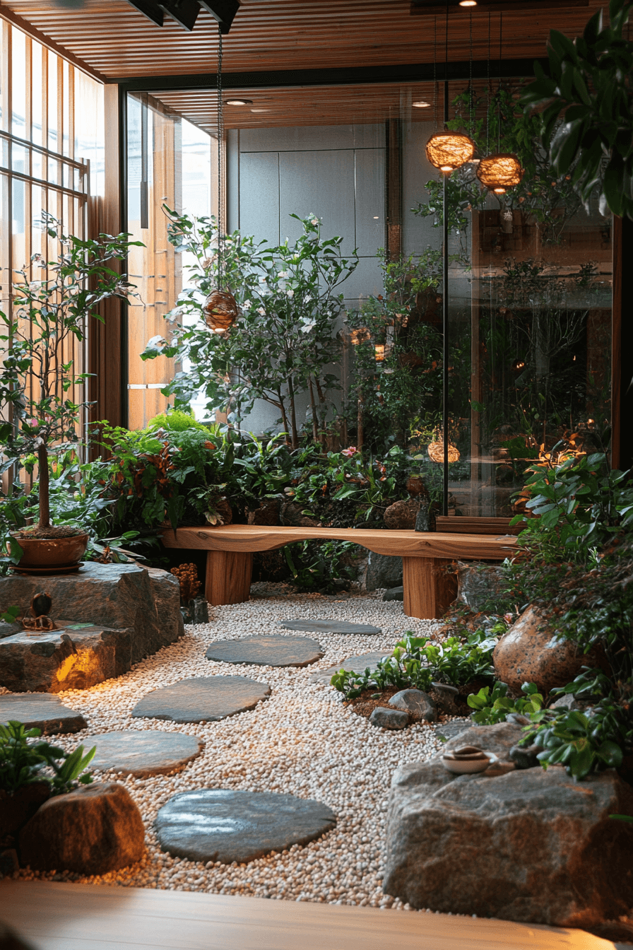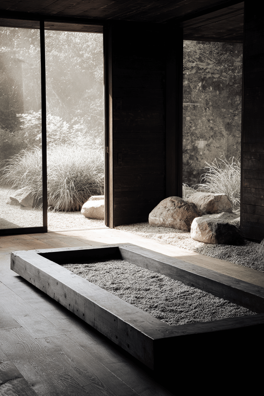 A winter garden showcases the harmony of a scandinavian japanese interior by blending light and nature. Glass walls invite outdoor views while maintaining warmth. Low seating encourages relaxation and mindfulness. Subtle greenery adds life without excess. Wood and stone balance the design naturally.