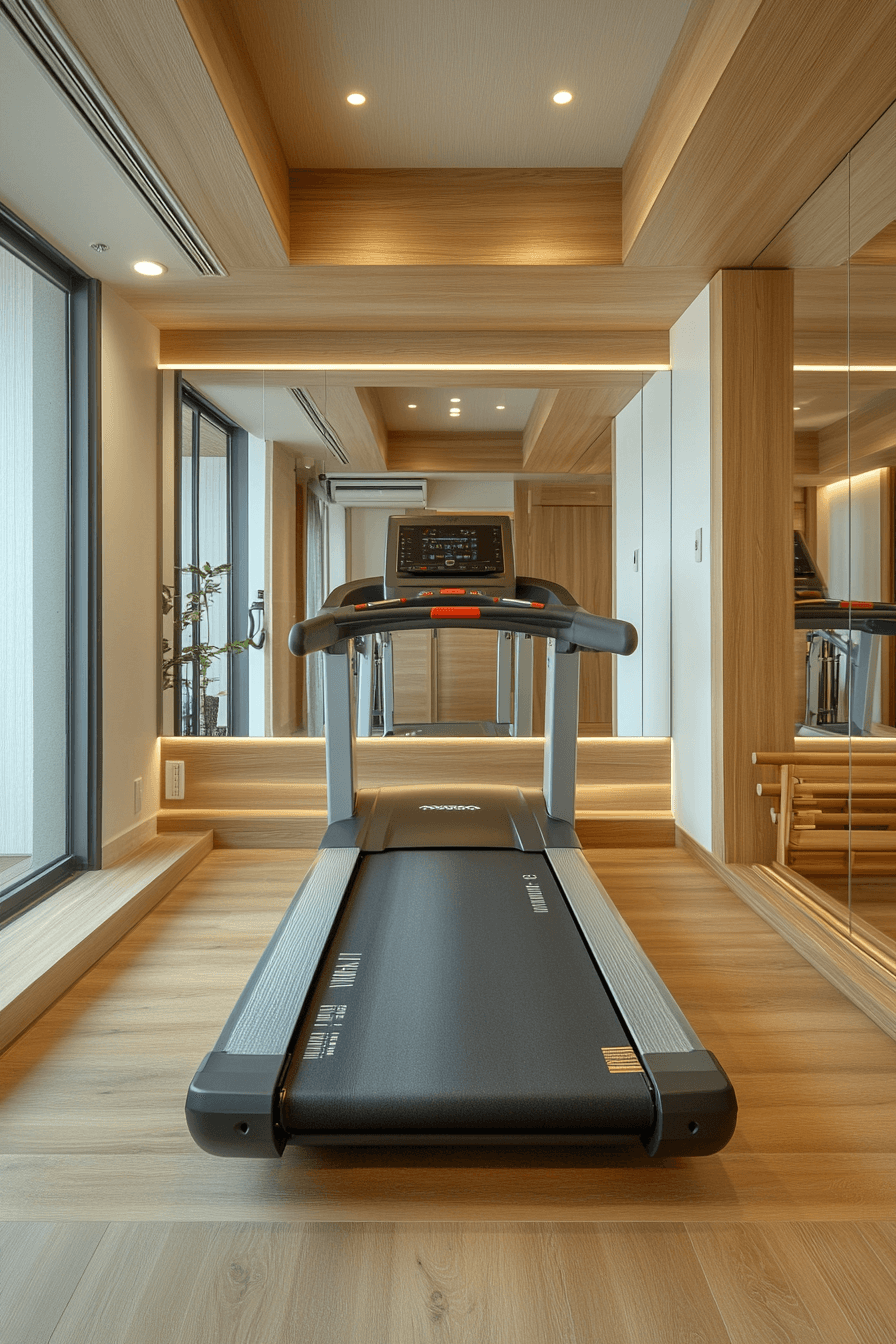 A serene home gym reflects the mindful energy of a scandinavian japanese interior by combining simplicity with purpose. Wood floors and diffused lighting establish a calming workout atmosphere. Minimal equipment keeps the space open and focused. Natural textures ground the room visually and emotionally. The environment supports both movement and restoration.