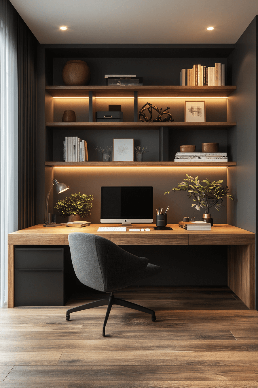 Designed to encourage clarity and focus, this home office draws from the calming principles of a scandinavian japanese interior. Clean-lined furnishings reduce distraction while natural wood details add warmth. Soft daylight highlights subtle textures and neutral tones throughout the space. The layout supports productivity without feeling rigid. A single handcrafted accent brings personality without clutter.