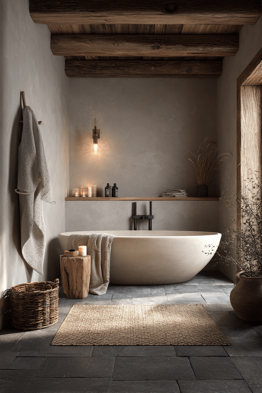 A spa-like bathroom experience emerges through the natural restraint of a scandinavian japanese interior. Raw wood accents and stone surfaces establish an organic and grounding feel. The layout remains open and uncluttered, allowing the design to breathe. Subtle imperfections add authenticity and warmth. The space feels calm, refined, and quietly luxurious.
